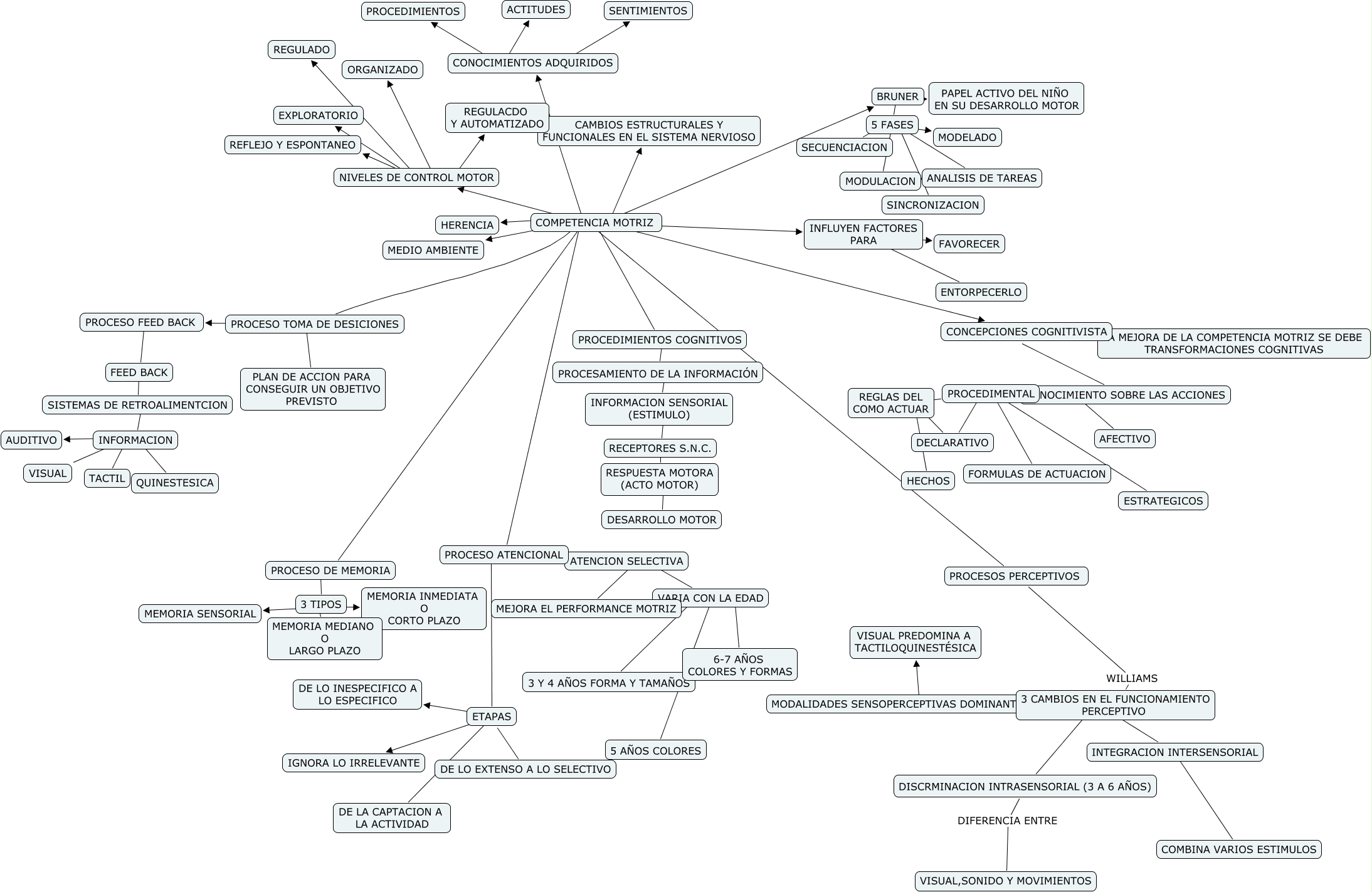 Este Cmap, tiene información relacionada con: DESARROLLO MOTOR CAP 6, CONOCIMIENTOS ADQUIRIDOS ???? SENTIMIENTOS, COMPETENCIA MOTRIZ ???? PROCESOS PERCEPTIVOS, PROCESAMIENTO DE LA INFORMACIÓN ???? INFORMACION SENSORIAL (ESTIMULO), 5 FASES ???? SECUENCIACION, PROCESOS PERCEPTIVOS WILLIAMS 3 CAMBIOS EN EL FUNCIONAMIENTO PERCEPTIVO, COMPETENCIA MOTRIZ ???? BRUNER, COMPETENCIA MOTRIZ ???? PROCESO TOMA DE DESICIONES, 5 FASES ???? ANALISIS DE TAREAS, COMPETENCIA MOTRIZ ???? CONOCIMIENTOS ADQUIRIDOS, BRUNER ???? 5 FASES, 3 CAMBIOS EN EL FUNCIONAMIENTO PERCEPTIVO ???? INTEGRACION INTERSENSORIAL, ATENCION SELECTIVA ???? VARIA CON LA EDAD, DECLARATIVO ???? HECHOS, PROCESO TOMA DE DESICIONES ???? PLAN DE ACCION PARA CONSEGUIR UN OBJETIVO PREVISTO, ETAPAS ???? IGNORA LO IRRELEVANTE, COMPETENCIA MOTRIZ ???? PROCESO ATENCIONAL, NIVELES DE CONTROL MOTOR ???? REGULADO, INFLUYEN FACTORES PARA ???? ENTORPECERLO, CONOCIMIENTO SOBRE LAS ACCIONES ???? PROCEDIMENTAL, PROCEDIMIENTOS COGNITIVOS ???? PROCESAMIENTO DE LA INFORMACIÓN