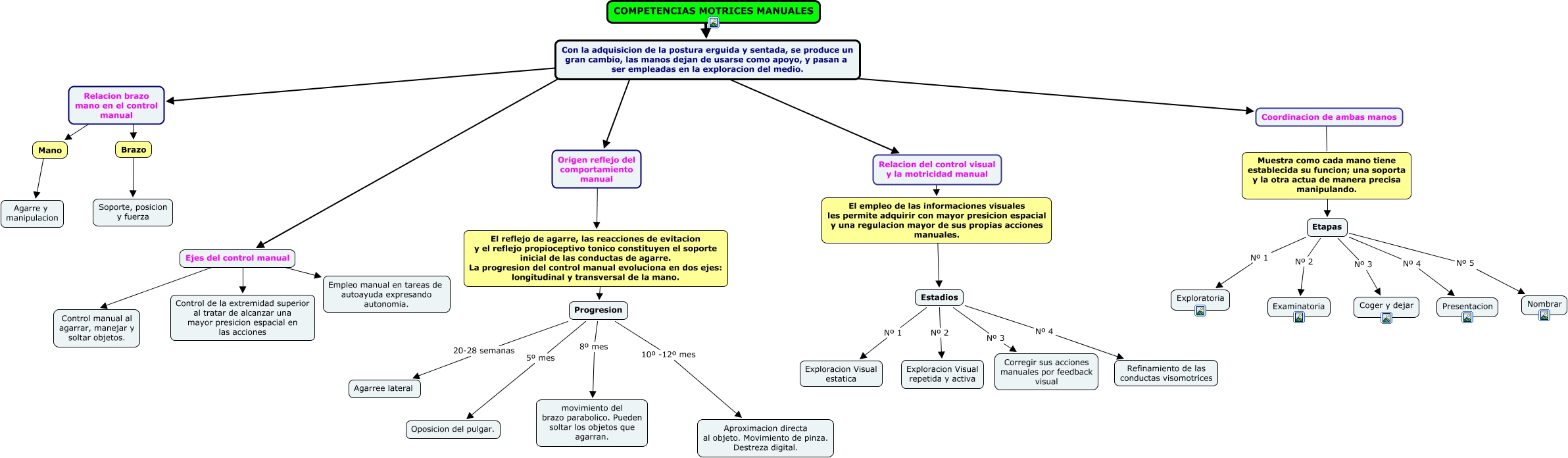 Este Cmap, tiene información relacionada con: COMPETENCIAS MOTRICES MANUALES, Coordinacion de ambas manos ???? Muestra como cada mano tiene establecida su funcion; una soporta y la otra actua de manera precisa manipulando., Brazo ???? Soporte, posicion y fuerza, Ejes del control manual ???? Control de la extremidad superior al tratar de alcanzar una mayor presicion espacial en las acciones, El empleo de las informaciones visuales les permite adquirir con mayor presicion espacial y una regulacion mayor de sus propias acciones manuales. ???? Estadios, Progresion 10º -12º mes Aproximacion directa al objeto. Movimiento de pinza. Destreza digital., Con la adquisicion de la postura erguida y sentada, se produce un gran cambio, las manos dejan de usarse como apoyo, y pasan a ser empleadas en la exploracion del medio. ???? Relacion del control visual y la motricidad manual, Estadios Nº 3 Corregir sus acciones manuales por feedback visual, Relacion brazo mano en el control manual ???? Mano, Muestra como cada mano tiene establecida su funcion; una soporta y la otra actua de manera precisa manipulando. ???? Etapas, COMPETENCIAS MOTRICES MANUALES ???? Con la adquisicion de la postura erguida y sentada, se produce un gran cambio, las manos dejan de usarse como apoyo, y pasan a ser empleadas en la exploracion del medio., Relacion brazo mano en el control manual ???? Brazo, Estadios Nº 2 Exploracion Visual repetida y activa, Etapas Nº 3 Coger y dejar, Etapas Nº 4 Presentacion, El reflejo de agarre, las reacciones de evitacion y el reflejo propioceptivo tonico constituyen el soporte inicial de las conductas de agarre. La progresion del control manual evoluciona en dos ejes: longitudinal y transversal de la mano. ???? Progresion, Etapas Nº 1 Exploratoria, Mano ???? Agarre y manipulacion, Con la adquisicion de la postura erguida y sentada, se produce un gran cambio, las manos dejan de usarse como apoyo, y pasan a ser empleadas en la exploracion del medio. ???? Relacion brazo mano en el control manual, Etapas Nº 2 Examinatoria, Progresion 8º mes movimiento del brazo parabolico. Pueden soltar los objetos que agarran.