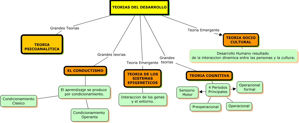 Este Cmap, tiene información relacionada con: TEORIAS DEL DESARROLLO, TEORIAS DEL DESARROLLO Grandes Teorias TEORIA PSICOANALITICA, TEORIA SOCIO CULTURAL ???? Desarrollo Humano resultado de la interaccion dinamica entre las personas y la cultura., TEORIAS DEL DESARROLLO Teoria Emergente TEORIA SOCIO CULTURAL, 4 Periodos Principales ???? Operacional, El aprendizaje se produce por condicionamiento. ???? Condicionamiento Clasico, TEORIAS DEL DESARROLLO Grandes teorias TEORIA COGNITIVA, TEORIAS DEL DESARROLLO Teoria Emergente TEORIA DE LOS SISTEMAS EPIGENETICOS, TEORIAS DEL DESARROLLO Grandes teorias EL CONDUCTISMO, 4 Periodos Principales ???? Sensorio Motor, 4 Periodos Principales ???? Operacional formal, 4 Periodos Principales ???? Preoperacional, El aprendizaje se produce por condicionamiento. ???? Condicionamiento Operante, TEORIA COGNITIVA ???? 4 Periodos Principales, EL CONDUCTISMO ???? El aprendizaje se produce por condicionamiento., TEORIA DE LOS SISTEMAS EPIGENETICOS ???? Interaccion de los genes y el entorno.