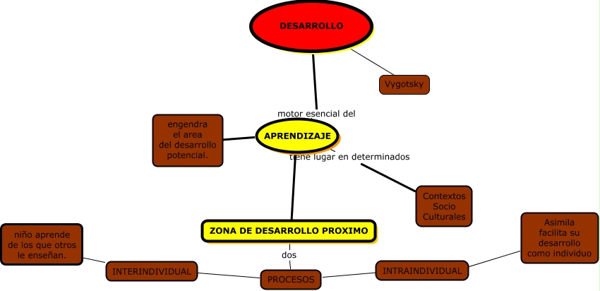 Este Cmap, tiene información relacionada con: DESARROLLO VYgotsky, INTERINDIVIDUAL ???? niño aprende de los que otros le enseñan., PROCESOS ???? INTERINDIVIDUAL, DESARROLLO motor esencial del APRENDIZAJE, PROCESOS ???? INTRAINDIVIDUAL, APRENDIZAJE ???? engendra el area del desarrollo potencial., APRENDIZAJE ???? ZONA DE DESARROLLO PROXIMO, APRENDIZAJE tiene lugar en determinados Contextos Socio Culturales, INTRAINDIVIDUAL ???? Asimila facilita su desarrollo como individuo, DESARROLLO ???? Vygotsky, ZONA DE DESARROLLO PROXIMO dos PROCESOS