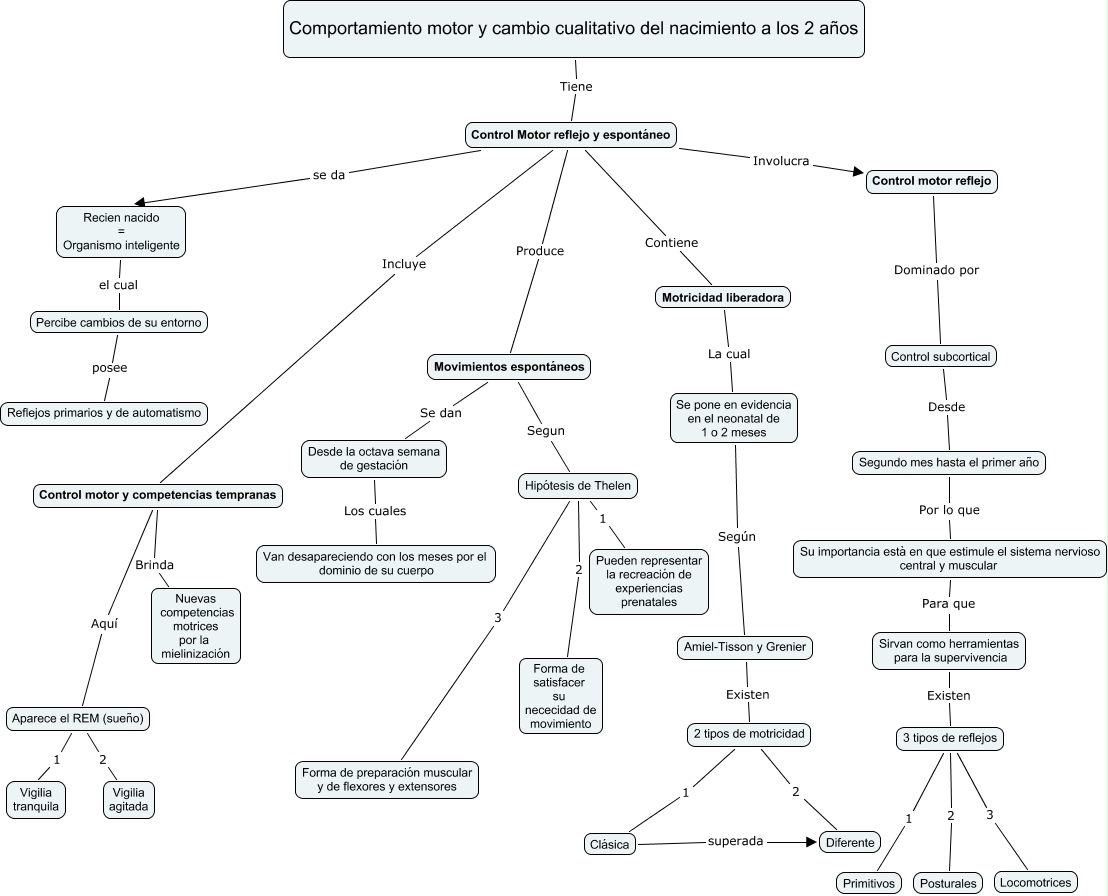 Este Cmap, tiene información relacionada con: 1, Sirvan como herramientas para la supervivencia Existen 3 tipos de reflejos, Recien nacido = Organismo inteligente el cual Percibe cambios de su entorno, Se pone en evidencia en el neonatal de 1 o 2 meses Según Amiel-Tisson y Grenier, 2 tipos de motricidad 2 Diferente, Control Motor reflejo y espontáneo Involucra Control motor reflejo, Control Motor reflejo y espontáneo Produce Movimientos espontáneos, Desde la octava semana de gestación Los cuales Van desapareciendo con los meses por el dominio de su cuerpo, 3 tipos de reflejos 2 Posturales, Aparece el REM (sueño) 2 Vigilia agitada, Hipótesis de Thelen 2 Forma de satisfacer su nececidad de movimiento, 3 tipos de reflejos 3 Locomotrices, Control Motor reflejo y espontáneo se da Recien nacido = Organismo inteligente, 2 tipos de motricidad 1 Clásica, Control subcortical Desde Segundo mes hasta el primer año, Segundo mes hasta el primer año Por lo que Su importancia està en que estimule el sistema nervioso central y muscular, Hipótesis de Thelen 1 Pueden representar la recreación de experiencias prenatales, Amiel-Tisson y Grenier Existen 2 tipos de motricidad, Comportamiento motor y cambio cualitativo del nacimiento a los 2 años Tiene Control Motor reflejo y espontáneo, Control motor y competencias tempranas Brinda Nuevas competencias motrices por la mielinización, Control Motor reflejo y espontáneo Incluye Control motor y competencias tempranas
