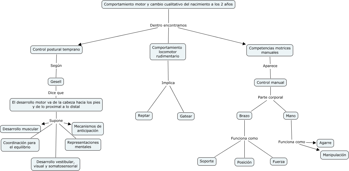 Este Cmap, tiene información relacionada con: 2, Brazo Funciona como Fuerza, Mano Funciona como Manipulación, Comportamiento locomotor rudimentario Implica Gatear, Competencias motrices manuales Aparece Control manual, Brazo Funciona como Soporte, El desarrollo motor va de la cabeza hacia los pies y de lo proximal a lo distal Supone Representaciones mentales, Brazo Funciona como Posición, Comportamiento motor y cambio cualitativo del nacimiento a los 2 años Dentro encontramos Comportamiento locomotor rudimentario, El desarrollo motor va de la cabeza hacia los pies y de lo proximal a lo distal Supone Desarrollo muscular, El desarrollo motor va de la cabeza hacia los pies y de lo proximal a lo distal Supone Desarrollo vestibular, visual y somatosensorial, Control manual Parte corporal Mano, Comportamiento locomotor rudimentario Implica Reptar, Mano Funciona como Agarre, Gesell Dice que El desarrollo motor va de la cabeza hacia los pies y de lo proximal a lo distal, El desarrollo motor va de la cabeza hacia los pies y de lo proximal a lo distal Supone Coordinación para el equilibrio, El desarrollo motor va de la cabeza hacia los pies y de lo proximal a lo distal Supone Mecanismos de anticipación, Comportamiento motor y cambio cualitativo del nacimiento a los 2 años Dentro encontramos Competencias motrices manuales, Control postural temprano Según Gesell, Control manual Parte corporal Brazo, Comportamiento motor y cambio cualitativo del nacimiento a los 2 años Dentro encontramos Control postural temprano