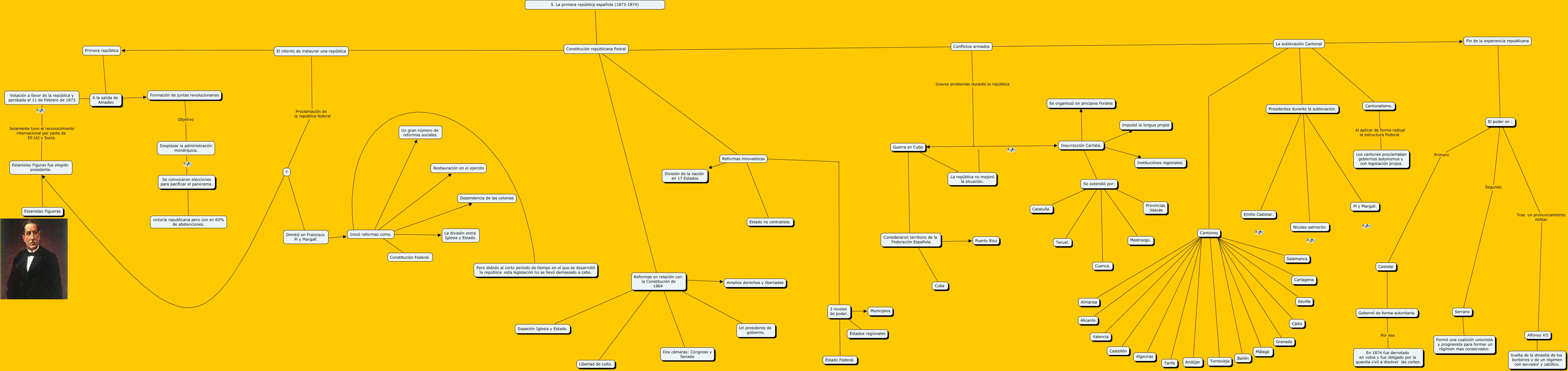 Este Cmap, tiene información relacionada con: Primera republica española, Cantones ???? Granada, Gobernó de forma autoritaria. Por eso En 1874 fue derrotado en votos y fue obligado por la guardia civil a disolver las cortes., Insurrección Carlista. ???? Se organiozó en pincipios Forales, Y ???? Dimitió en Francisco Pi y Margall., Reformas innovadoras ???? División de la nación en 17 Estados, Cantones ???? Bailén, Formación de juntas revolucionarias Objetivo Desplazar la administración monárquica., Se convocaron elecciones para pacificar el panorama. ???? victoria republicana pero con en 60% de abstenciones., El poder en : Segundo Serrano, Serrano ???? Formó una coalición unionista y progresista para formar un régimen mas conservador., Reformas en relación con la Constitución de 1864 ???? Dos cámaras: Congreso y Senado, Cantonalismo. Al aplicar de forma radical la estructura Federal. Los cantones proclamaban gobiernos autonomos y con legislación propia., 5. La primera república española (1873-1874) ???? Primera república, Presidentes durante la sublevación. ???? Emilio Castelar., 5. La primera república española (1873-1874) ???? Fin de la experiencia republicana, Consideraron territorio de la Federación Española. ???? Cuba, Cantones ???? Salamanca, Cantones ???? Tarifa, Inició reformas como. ???? Constitución Federal., Desplazar la administración monárquica. ???? Se convocaron elecciones para pacificar el panorama.