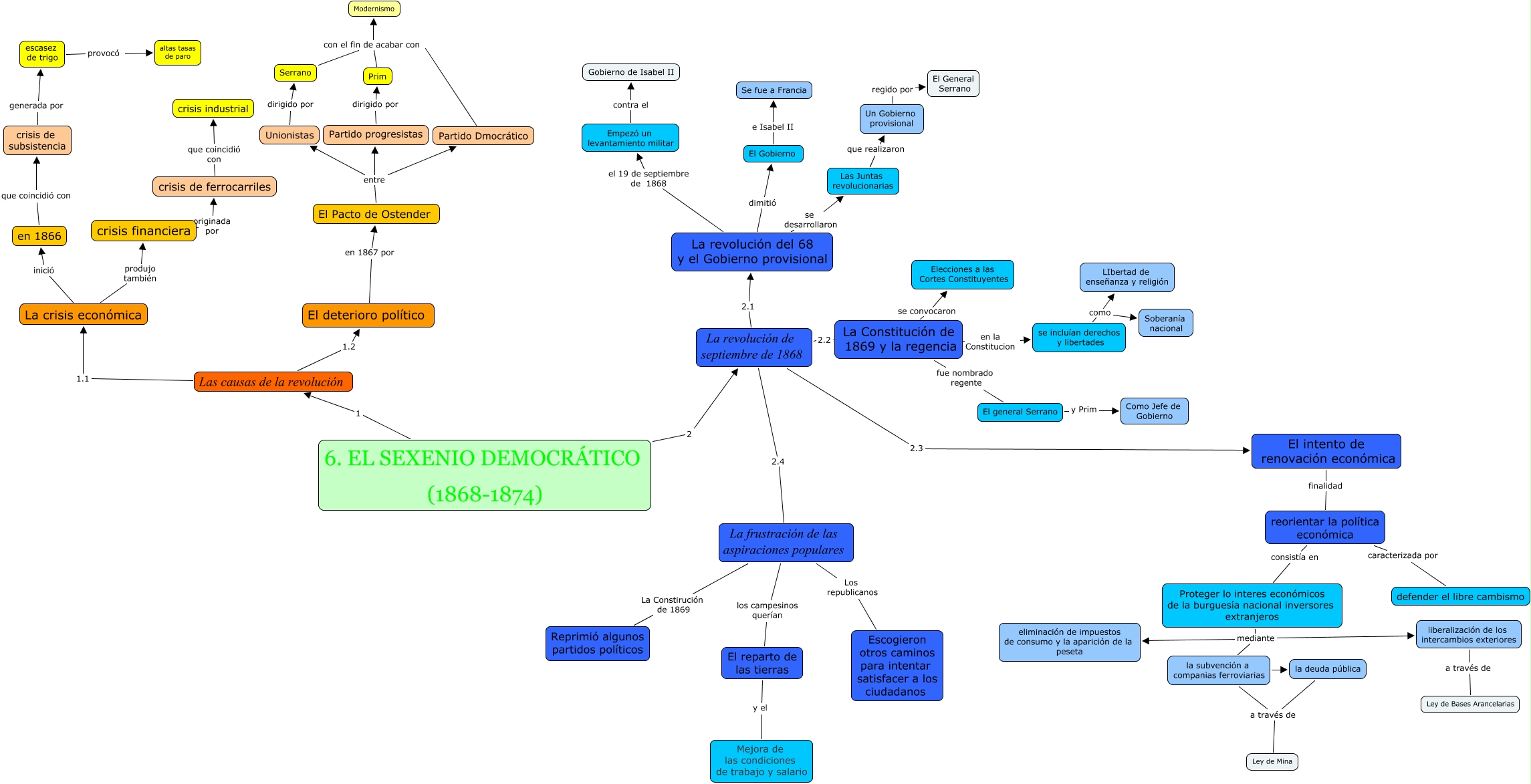 Este Cmap, tiene información relacionada con: punto 1 y 2, La Constitución de 1869 y la regencia se convocaron Elecciones a las Cortes Constituyentes, La frustración de las aspiraciones populares La Constirución de 1869 Reprimió algunos partidos políticos, El general Serrano y Prim Como Jefe de Gobierno, La revolución del 68 y el Gobierno provisional el 19 de septiembre de 1868 Empezó un levantamiento militar, Proteger lo interes económicos de la burguesía nacional inversores extranjeros mediante eliminación de impuestos de consumo y la aparición de la peseta, Proteger lo interes económicos de la burguesía nacional inversores extranjeros mediante liberalización de los intercambios exteriores, La revolución del 68 y el Gobierno provisional dimitió El Gobierno, Un Gobierno provisional regido por El General Serrano, 6. EL SEXENIO DEMOCRÁTICO (1868-1874) 1 Las causas de la revolución, El reparto de las tierras y el Mejora de las condiciones de trabajo y salario, liberalización de los intercambios exteriores a través de Ley de Bases Arancelarias, Prim con el fin de acabar con Modernismo, Unionistas dirigido por Serrano, Serrano con el fin de acabar con Modernismo, El intento de renovación económica finalidad reorientar la política económica, La Constitución de 1869 y la regencia fue nombrado regente El general Serrano, Las causas de la revolución 1.1 La crisis económica, se incluían derechos y libertades como LIbertad de enseñanza y religión, en 1866 que coincidió con crisis de subsistencia, crisis de subsistencia generada por escasez de trigo