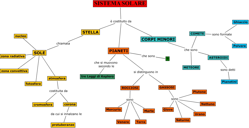 Questa Cmap, creata con IHMC CmapTools, contiene informazioni relative a: Sistema Solare, ROCCIOSI sono Mercurio, GASSOSI sono Saturno, SOLE ???? fotosfera, STELLA chiamata SOLE, PIANETI si distinguono in ROCCIOSI, SOLE ???? zona convettiva, CORPI MINORI che sono COMETE, GASSOSI sono Urano, CORPI MINORI che sono ASTEROIDI, corona da cui si innalzano le protuberanze, PIANETI che sono 9, atmosfera costituita da corona, GASSOSI sono Nettuno, SOLE ???? nucleo, GASSOSI sono Plutone, SOLE ???? zona radiativa, ROCCIOSI sono Marte, COMETE sono formate Polvere, PIANETI è costituito da CORPI MINORI, ASTEROIDI sono detti Pianetini