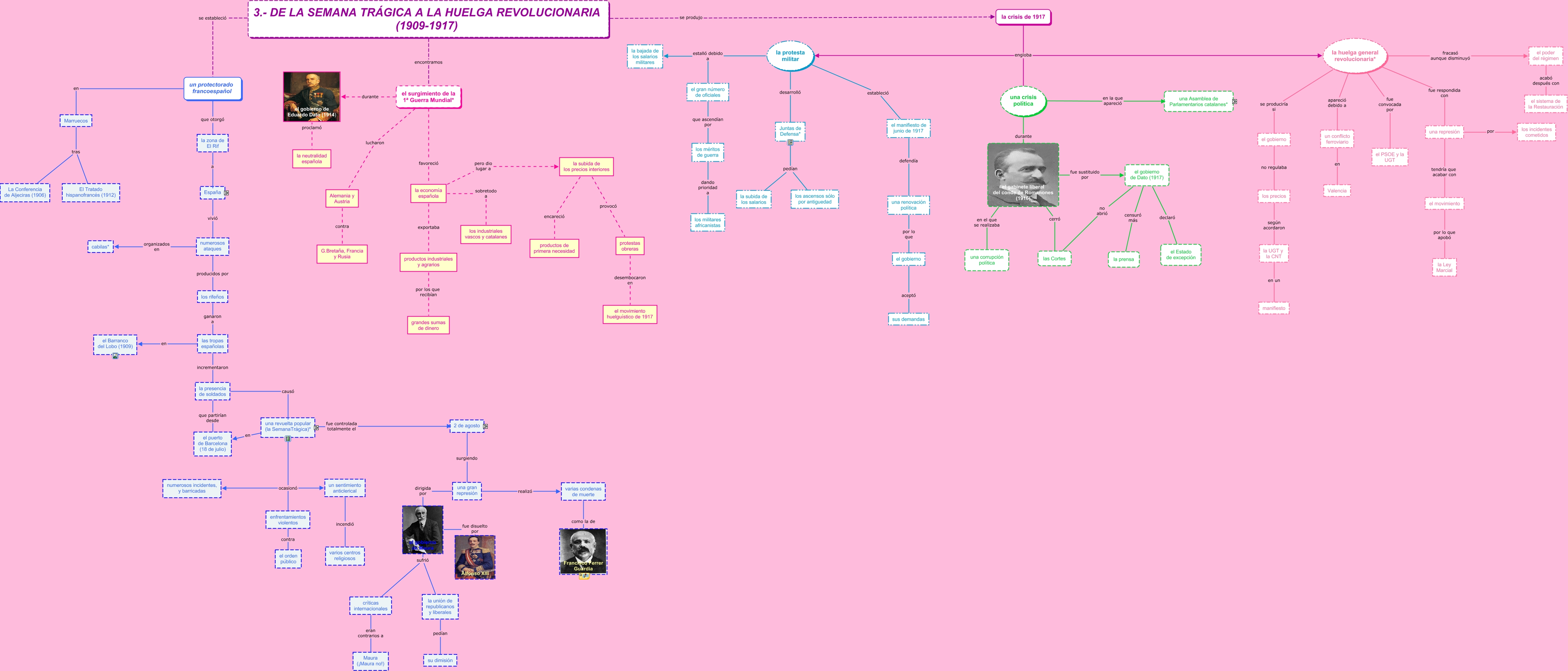 Este Cmap, tiene información relacionada con: Punto 3, una gran represión dirigida por el gobierno de Maura, un protectorado francoespañol que otorgó la zona de El Rif, el gobierno de Dato (1917) no abrió las Cortes, la economía española pero dio lugar a la subida de los precios interiores, una Asamblea de Parlamentarios catalanes llamó a los diputados y senadores españoles, 2 de agosto después de la ausencia de dirección y coordinación, una reunión (19 de julio) fue disuelta por la Guardia Civil, 3.- DE LA SEMANA TRÁGICA A LA HUELGA REVOLUCIONARIA (1909-1917) se estableció un protectorado francoespañol, 2 de agosto surgiendo una gran represión, el gobierno de Dato (1917) censuró más la prensa, un conflicto ferroviario en Valencia, una revuelta popular (la SemanaTrágica)* ocasionó numerosos incidentes, y barricadas, las tropas españolas en el Barranco del Lobo (1909), una revuelta popular (la SemanaTrágica)* fue controlada totalmente el 2 de agosto, la protesta militar estableció el manifiesto de junio de 1917, la crisis de 1917 engloba una crisis política, los diputados y senadores españoles con el fin de asistir a una reunión (19 de julio), la huelga general revolucionaria* apareció debido a un conflicto ferroviario, el movimiento por lo que apobó la Ley Marcial, una revuelta popular (la SemanaTrágica)* ocasionó un sentimiento anticlerical