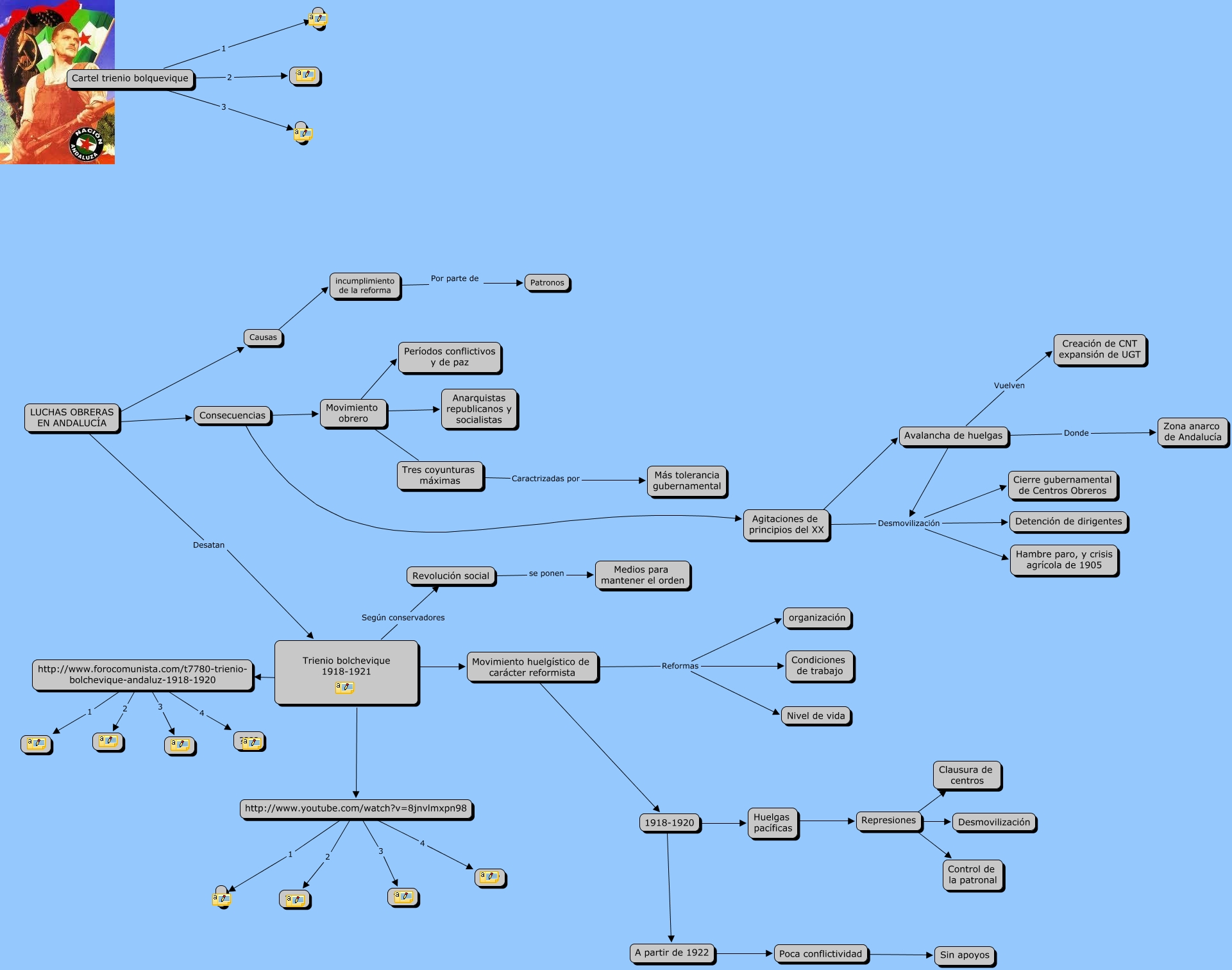Este Cmap, tiene información relacionada con: tema 11 pnt 6, A partir de 1922 ???? Poca conflictividad, Represiones ???? Control de la patronal, Agitaciones de principios del XX Desmovilización Hambre paro, y crisis agrícola de 1905, Huelgas pacíficas ???? Represiones, Revolución social se ponen Medios para mantener el orden, Movimiento huelgístico de carácter reformista Reformas organización, Avalancha de huelgas Vuelven Creación de CNT expansión de UGT, Trienio bolchevique 1918-1921 ???? Movimiento huelgístico de carácter reformista, Movimiento obrero ???? Anarquistas republicanos y socialistas, Movimiento huelgístico de carácter reformista ???? 1918-1920, http://www.forocomunista.com/t7780-trienio- bolchevique-andaluz-1918-1920 1 ????, Agitaciones de principios del XX Desmovilización Cierre gubernamental de Centros Obreros, Trienio bolchevique 1918-1921 Según conservadores Revolución social, 1918-1920 ???? Huelgas pacíficas, Cartel trienio bolquevique 1, Consecuencias ???? Movimiento obrero, LUCHAS OBRERAS EN ANDALUCÍA ???? Consecuencias, Agitaciones de principios del XX Desmovilización Detención de dirigentes, Cartel trienio bolquevique 3, 1918-1920 ???? A partir de 1922