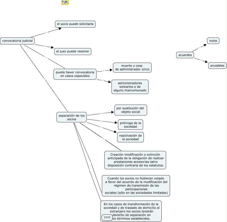This Concept Map, created with IHMC CmapTools, has information related to: caso 6, convocatoria judicial . el socio puede solicitarla, separación de los socios . ????, convocatoria judicial . separación de los socios, acuerdos . anulables, separación de los socios . prórroga de la sociedad, separación de los socios . Creación modificación o extinción anticipada de la obligación de realizar prestaciones accesorias salvo disposición contraria de los estatutos., separación de los socios . por sustitución del objeto social, acuerdos . nulos, puede haver convocatoria en casos especiales . muerte o cese de administrador único, separación de los socios . reactivación de la sociedad, convocatoria judicial . el juez puede resolver, convocatoria judicial . puede haver convocatoria en casos especiales, separación de los socios . Creación modificación o extinción anticipada de la obligación de realizar prestaciones accesorias salvo disposición contraria de los estatutos., separación de los socios . Cuando los socios no hubieran votado a favor del acuerdo de la modificación del régimen de transmisión de las participaciones sociales (sólo en las sociedades limitadas), puede haver convocatoria en casos especiales . administradores solicarios o de alguno mancomunado