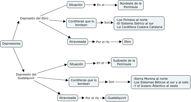 Este Cmap, tiene información relacionada con: Las Depresiones, Depresiones Depresión del Gudalquivir Situación, Situación En el Sudoeste de la Península, Depresiones Depresión del Gudalquivir Cordilleras que lo bordean, Atravesada Por el río Ebro, Situación Depresión del Ebro Cordilleras que lo bordean, Cordilleras que lo bordean Son -Sierra Morena al norte -Los Sistemas Béticos al sur y al este -Y el óceano Átlantico al oeste, Situación En el Nordeste de la Península, Depresiones Depresión del Gudalquivir Atravesada, Atravesada Por el río Guadalquivir, Cordilleras que lo bordean Son -Los Pirineos al norte -El Sistema Ibérico al sur -La Cordillera Costera Catalana, Depresiones Depresión del Ebro Cordilleras que lo bordean, Situación Depresión del Ebro Atravesada, Depresiones Depresión del Ebro Atravesada