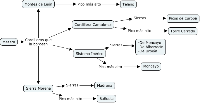 Este Cmap, tiene información relacionada con: Cordilleras que rodean la meseta, Cordillera Cantábrica Sierras Picos de Europa, Sistema Ibérico Sierras -De Moncayo -De Albarracín -De Urbión, Sistema Ibérico Pico más alto Moncayo, Meseta Cordilleras que la bordean Cordillera Cantábrica, Meseta Cordilleras que la bordean Sierra Morena, Meseta Cordilleras que la bordean Montes de León, Meseta Cordilleras que la bordean Sistema Ibérico, Cordillera Cantábrica Pico más alto Torre Cerredo, Sierra Morena Pico más alto Bañuela, Montes de León Pico más alto Teleno, Sierra Morena Sierras Madrona