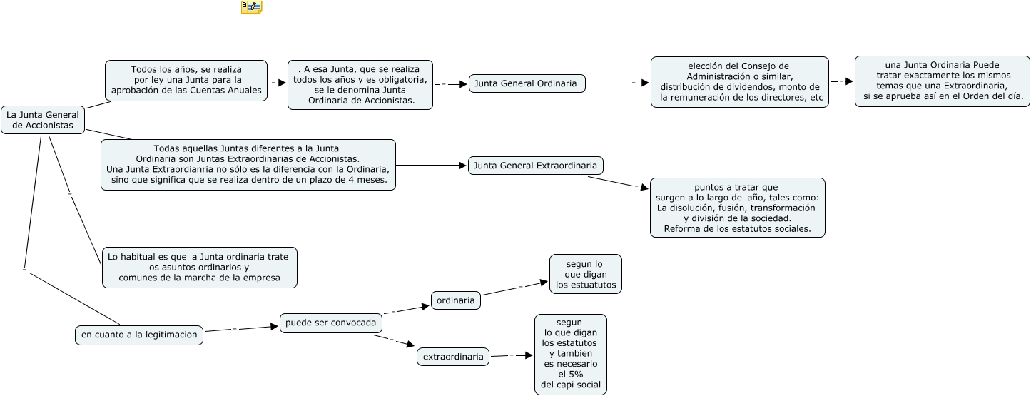 This Concept Map, created with IHMC CmapTools, has information related to: cas 4 corregit, Junta General Extraordinaria . puntos a tratar que surgen a lo largo del año, tales como: La disolución, fusión, transformación y división de la sociedad. Reforma de los estatutos sociales., Junta General Ordinaria . elección del Consejo de Administración o similar, distribución de dividendos, monto de la remuneración de los directores, etc, puede ser convocada . ordinaria, Todas aquellas Juntas diferentes a la Junta Ordinaria son Juntas Extraordinarias de Accionistas. Una Junta Extraordianria no sólo es la diferencia con la Ordinaria, sino que significa que se realiza dentro de un plazo de 4 meses. . Junta General Extraordinaria, ordinaria . segun lo que digan los estuatutos, en cuanto a la legitimacion . puede ser convocada, La Junta General de Accionistas . Lo habitual es que la Junta ordinaria trate los asuntos ordinarios y comunes de la marcha de la empresa, Todos los años, se realiza por ley una Junta para la aprobación de las Cuentas Anuales . . A esa Junta, que se realiza todos los años y es obligatoria, se le denomina Junta Ordinaria de Accionistas., elección del Consejo de Administración o similar, distribución de dividendos, monto de la remuneración de los directores, etc . una Junta Ordinaria Puede tratar exactamente los mismos temas que una Extraordinaria, si se aprueba así en el Orden del día., La Junta General de Accionistas . en cuanto a la legitimacion, puede ser convocada . extraordinaria, La Junta General de Accionistas . Todas aquellas Juntas diferentes a la Junta Ordinaria son Juntas Extraordinarias de Accionistas. Una Junta Extraordianria no sólo es la diferencia con la Ordinaria, sino que significa que se realiza dentro de un plazo de 4 meses., extraordinaria . segun lo que digan los estatutos y tambien es necesario el 5% del capi social, . A esa Junta, que se realiza todos los años y es obligatoria, se le denomina Junta Ordinaria de Accionistas. . Junta General Ordinaria, La Junta General de Accionistas . Todos los años, se realiza por ley una Junta para la aprobación de las Cuentas Anuales