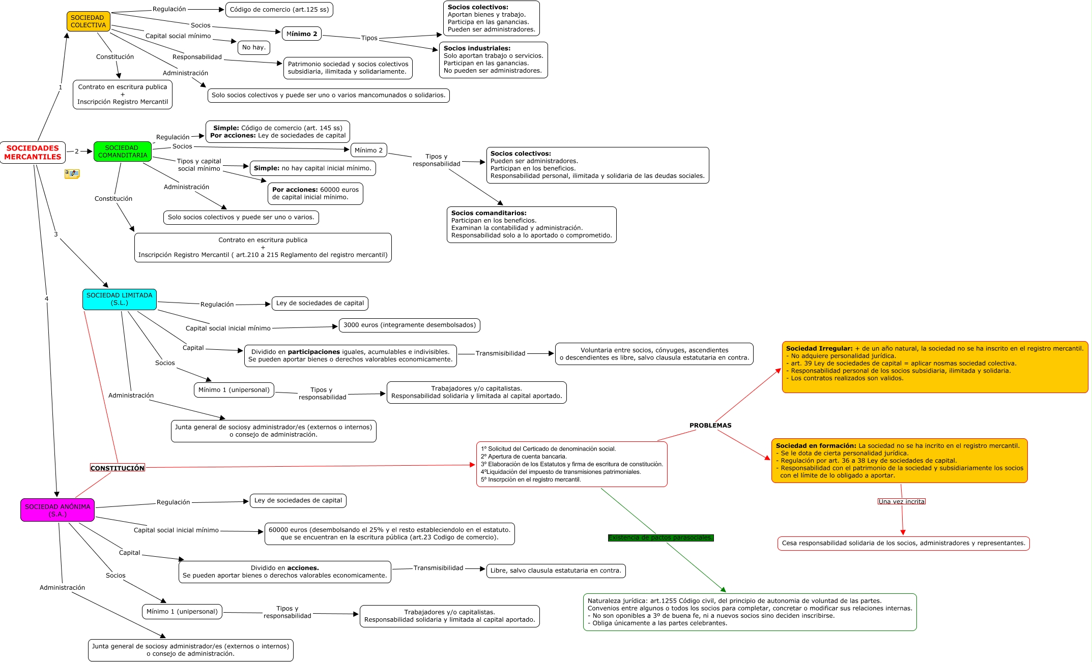 Este Cmap, tiene información relacionada con: Sociedadesmercantiles_AlfonsoRodenasGonzalez_mapa1, SOCIEDAD LIMITADA (S.L.) CONSTITUCIÓN 1º Solicitud del Certicado de denominación social. 2º Apertura de cuenta bancaria. 3º Elaboración de los Estatutos y firma de escritura de constitución. 4ºLiquidación del impuesto de transmisiones patrimoniales. 5º Inscrpción en el registro mercantil., SOCIEDAD COLECTIVA Socios Mínimo 2, Mínimo 2 Tipos y responsabilidad Socios colectivos: Pueden ser administradores. Participan en los beneficios. Responsabilidad personal, ilimitada y solidaria de las deudas sociales., SOCIEDAD LIMITADA (S.L.) Administración Junta general de sociosy administrador/es (externos o internos) o consejo de administración., SOCIEDAD COMANDITARIA Tipos y capital social mínimo Por acciones: 60000 euros de capital inicial mínimo., 1º Solicitud del Certicado de denominación social. 2º Apertura de cuenta bancaria. 3º Elaboración de los Estatutos y firma de escritura de constitución. 4ºLiquidación del impuesto de transmisiones patrimoniales. 5º Inscrpción en el registro mercantil. Existencia de pactos parasociales. Naturaleza jurídica: art.1255 Código civil, del principio de autonomia de voluntad de las partes. Convenios entre algunos o todos los socios para completar, concretar o modificar sus relaciones internas. - No son oponibles a 3º de buena fe, ni a nuevos socios sino deciden inscribirse. - Obliga únicamente a las partes celebrantes., SOCIEDAD ANÓNIMA (S.A.) Administración Junta general de sociosy administrador/es (externos o internos) o consejo de administración., SOCIEDADES MERCANTILES 2 SOCIEDAD COMANDITARIA, SOCIEDAD COLECTIVA Constitución Contrato en escritura publica + Inscripción Registro Mercantil, SOCIEDADES MERCANTILES 3 SOCIEDAD LIMITADA (S.L.), SOCIEDAD COMANDITARIA Regulación Simple: Código de comercio (art. 145 ss) Por acciones: Ley de sociedades de capital, SOCIEDAD COMANDITARIA Socios Mínimo 2, Mínimo 2 Tipos Socios industriales: Solo aportan trabajo o servicios. Participan en las ganancias. No pueden ser administradores., Dividido en participaciones iguales, acumulables e indivisibles. Se pueden aportar bienes o derechos valorables economicamente. Transmisibilidad Voluntaria entre socios, cónyuges, ascendientes o descendientes es libre, salvo clausula estatutaria en contra., Dividido en acciones. Se pueden aportar bienes o derechos valorables economicamente. Transmisibilidad Libre, salvo clausula estatutaria en contra., SOCIEDAD ANÓNIMA (S.A.) CONSTITUCIÓN 1º Solicitud del Certicado de denominación social. 2º Apertura de cuenta bancaria. 3º Elaboración de los Estatutos y firma de escritura de constitución. 4ºLiquidación del impuesto de transmisiones patrimoniales. 5º Inscrpción en el registro mercantil., SOCIEDAD ANÓNIMA (S.A.) Socios Mínimo 1 (unipersonal), Mínimo 2 Tipos Socios colectivos: Aportan bienes y trabajo. Participa en las ganancias. Pueden ser administradores., Mínimo 1 (unipersonal) Tipos y responsabilidad Trabajadores y/o capitalistas. Responsabilidad solidaria y limitada al capital aportado., SOCIEDAD COLECTIVA Administración Solo socios colectivos y puede ser uno o varios mancomunados o solidarios.