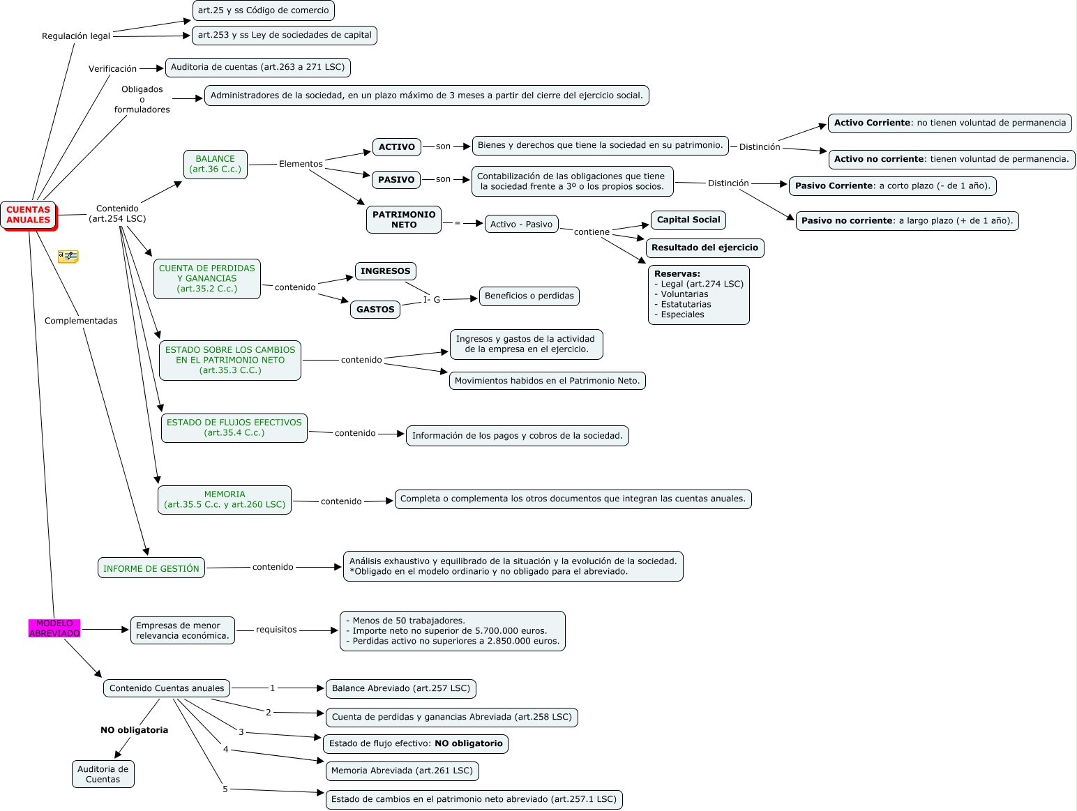 Este Cmap, tiene información relacionada con: CuentasAnuales_AlfonsoRodenas, ESTADO SOBRE LOS CAMBIOS EN EL PATRIMONIO NETO (art.35.3 C.C.) contenido Movimientos habidos en el Patrimonio Neto., CUENTAS ANUALES MODELO ABREVIADO Contenido Cuentas anuales, GASTOS I- G Beneficios o perdidas, Contabilización de las obligaciones que tiene la sociedad frente a 3º o los propios socios. Distinción Pasivo Corriente: a corto plazo (- de 1 año)., PASIVO son Contabilización de las obligaciones que tiene la sociedad frente a 3º o los propios socios., Empresas de menor relevancia económica. requisitos - Menos de 50 trabajadores. - Importe neto no superior de 5.700.000 euros. - Perdidas activo no superiores a 2.850.000 euros., Contenido Cuentas anuales 2 Cuenta de perdidas y ganancias Abreviada (art.258 LSC), CUENTAS ANUALES Contenido (art.254 LSC) ESTADO DE FLUJOS EFECTIVOS (art.35.4 C.c.), CUENTAS ANUALES Regulación legal art.25 y ss Código de comercio, ACTIVO son Bienes y derechos que tiene la sociedad en su patrimonio., CUENTAS ANUALES Verificación Auditoria de cuentas (art.263 a 271 LSC), Bienes y derechos que tiene la sociedad en su patrimonio. Distinción Activo Corriente: no tienen voluntad de permanencia, CUENTAS ANUALES Complementadas INFORME DE GESTIÓN, CUENTAS ANUALES Contenido (art.254 LSC) ESTADO SOBRE LOS CAMBIOS EN EL PATRIMONIO NETO (art.35.3 C.C.), CUENTA DE PERDIDAS Y GANANCIAS (art.35.2 C.c.) contenido GASTOS, PATRIMONIO NETO = Activo - Pasivo, INFORME DE GESTIÓN contenido Análisis exhaustivo y equilibrado de la situación y la evolución de la sociedad. *Obligado en el modelo ordinario y no obligado para el abreviado., CUENTAS ANUALES Obligados o formuladores Administradores de la sociedad, en un plazo máximo de 3 meses a partir del cierre del ejercicio social., CUENTAS ANUALES Contenido (art.254 LSC) MEMORIA (art.35.5 C.c. y art.260 LSC), CUENTA DE PERDIDAS Y GANANCIAS (art.35.2 C.c.) contenido INGRESOS