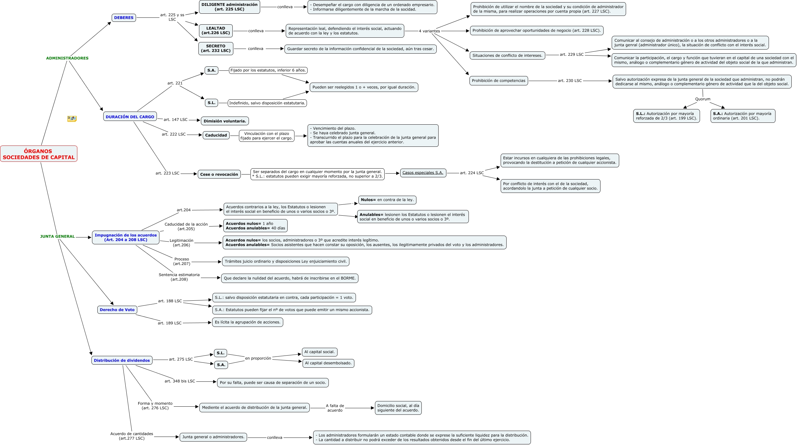 Este Cmap, tiene información relacionada con: Mapa a las primeres de canvi, Acuerdos contrarios a la ley, los Estatutos o lesionen el interés social en beneficio de unos o varios socios o 3º. - Nulos= en contra de la ley., Prohibición de competencias art. 230 LSC Salvo autorización expresa de la junta general de la sociedad que administran, no podrán dedicarse al mismo, análogo o complementario género de actividad que la del objeto social., S.L. en proporción Al capital social., DEBERES art. 225 y ss LSC LEALTAD (art.226 LSC), DEBERES art. 225 y ss LSC SECRETO (art. 232 LSC), Impugnación de los acuerdos (Art. 204 a 208 LSC) art.204 Acuerdos contrarios a la ley, los Estatutos o lesionen el interés social en beneficio de unos o varios socios o 3º., ÓRGANOS SOCIEDADES DE CAPITAL ADMINISTRADORES DURACIÓN DEL CARGO, DILIGENTE administración (art. 225 LSC) conlleva - Desempeñar el cargo con diligencia de un ordenado empresario. - Informarse diligentemente de la marcha de la socidad., SECRETO (art. 232 LSC) conlleva Guardar secreto de la información confidencial de la sociedad, aún tras cesar., ÓRGANOS SOCIEDADES DE CAPITAL JUNTA GENERAL Derecho de Voto, DURACIÓN DEL CARGO art. 222 LSC Caducidad, Impugnación de los acuerdos (Art. 204 a 208 LSC) Legitimación (art.206) Acuerdos nulos= los socios, administradores o 3º que acredite interés legítimo. Acuerdos anulables= Socios asistentes que hacen constar su oposición, los ausentes, los ilegitimamente privados del voto y los administradores., Derecho de Voto art. 188 LSC S.A.: Estatutos pueden fijar el nº de votos que puede emitir un mismo accionista., LEALTAD (art.226 LSC) conlleva Representación leal, defendiendo el interés social, actuando de acuerdo con la ley y los estatutos., Salvo autorización expresa de la junta general de la sociedad que administran, no podrán dedicarse al mismo, análogo o complementario género de actividad que la del objeto social. Quorum S.L.: Autorización por mayoría reforzada de 2/3 (art. 199 LSC)., DEBERES art. 225 y ss LSC DILIGENTE administración (art. 225 LSC), Situaciones de conflicto de intereses. art. 229 LSC Comunicar la participación, el cargo y función que tuvieran en el capital de una sociedad con el mismo, análogo o complementario género de actividad del objeto social de la que administran., Impugnación de los acuerdos (Art. 204 a 208 LSC) Caducidad de la acción (art.205) Acuerdos nulos= 1 año Acuerdos anulables= 40 días, Casos especiales S.A. art. 224 LSC Estar incursos en cualquiera de las prohibiciones legales, provocando la destitución a petición de cualquier accionista., Impugnación de los acuerdos (Art. 204 a 208 LSC) Proceso (art.207) Trámites juicio ordinario y disposiciones Ley enjuiciamiento civil.