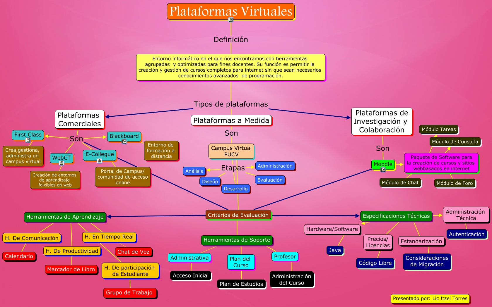 Este mapa conceptual tiene información relacionada a: Plataformas Virtuales, Estandarización ???? Consideraciones de Migración, Especificaciones Técnicas ???? Estandarización, Paquete de Software para la creación de cursos y sitios webbasados en internet ???? Módulo de Foro, Plataformas Comerciales Son E-Collegue, Plataformas Comerciales Son First Class, H. En Tiempo Real ???? Chat de Voz, Especificaciones Técnicas ???? Administración Técnica, Plataformas Comerciales Son Blackboard, Especificaciones Técnicas ???? Hardware/Software, Campus Virtual PUCV Etapas Desarrollo, Campus Virtual PUCV Etapas Diseño, Herramientas de Aprendizaje ???? H. De Comunicación, H. De Productividad ???? Marcador de Libro, WebCT ???? Creación de entornos de aprendizaje felxibles en web, Paquete de Software para la creación de cursos y sitios webbasados en internet ???? Módulo de Chat, Plan del Curso ???? Plan de Estudios, Campus Virtual PUCV Etapas Análisis, Criterios de Evaluación ???? Herramientas de Aprendizaje, H. De participación de Estudiante ???? Grupo de Trabajo, Administrativa ???? Acceso Inicial