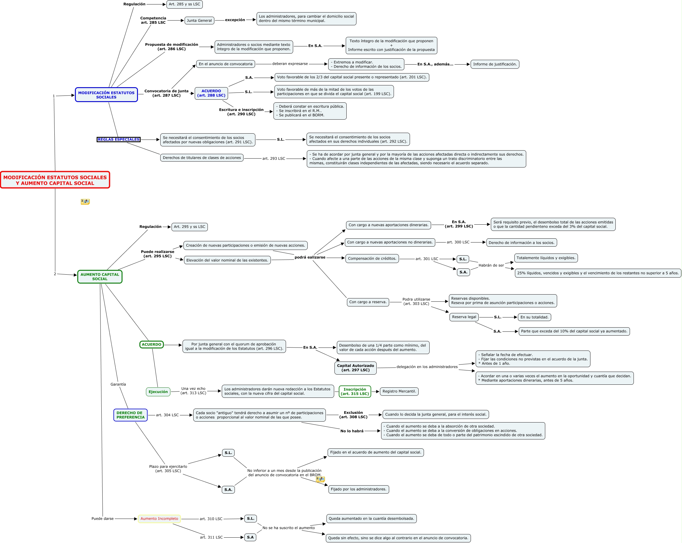 Este Cmap, tiene información relacionada con: Blue Transparence, Elevación del valor nominal de las existentes. podrá ealizarse Compensación de créditos., MODIFICACIÓN ESTATUTOS SOCIALES Convocatoria de junta (art. 287 LSC) ACUERDO (art. 288 LSC), AUMENTO CAPITAL SOCIAL ACUERDO Ejecución, Creación de nuevas participaciones o emisión de nuevas acciones. podrá ealizarse Compensación de créditos., Reserva legal S.L. En su totalidad., S.L. No se ha suscrito el aumento Queda sin efecto, sino se dice algo al contrario en el anuncio de convocatoria., Ejecución Una vez echo (art. 313 LSC) Los administradores darán nueva redacción a los Estatutos sociales, con la nueva cifra del capital social., Administradores o socios mediante texto íntegro de la modificación que proponen. En S.A. Texto íntegro de la modificación que proponen + Informe escrito con justificación de la propuesta, Elevación del valor nominal de las existentes. podrá ealizarse Con cargo a reserva., AUMENTO CAPITAL SOCIAL Puede darse Aumento Incompleto, S.L. No se ha suscrito el aumento Queda aumentado en la cuantía desembolsada., Con cargo a reserva. Podra utilizarse (art. 303 LSC) Reservas disponibles. Reseva por prima de asunción participaciones o acciones., ACUERDO (art. 288 LSC) S.A. Voto favorable de los 2/3 del capital social presente o representado (art. 201 LSC)., Creación de nuevas participaciones o emisión de nuevas acciones. podrá ealizarse Con cargo a nuevas aportaciones dinerarias., S.A. Habrán de ser Totalemente líquidos y exigibles., Junta General excepción Los administradores, para cambiar el domicilio social dentro del mismo término municipal., ACUERDO (art. 288 LSC) S.L. Voto favorable de más de la mitad de los votos de las participaciones en que se divida el capital social (art. 199 LSC)., Aumento Incompleto art. 311 LSC S.A, S.L. Habrán de ser Totalemente líquidos y exigibles., Elevación del valor nominal de las existentes. podrá ealizarse Con cargo a nuevas aportaciones no dinerarias.