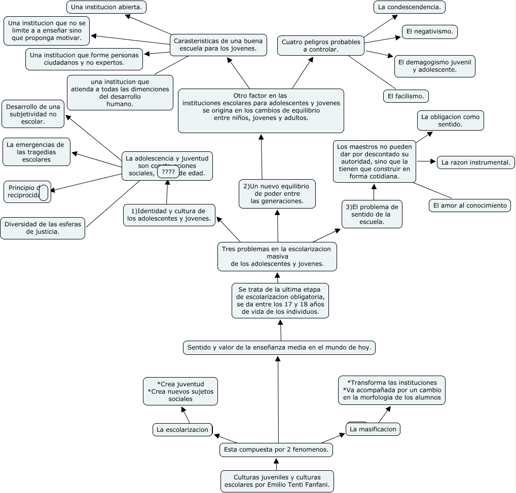 Este mapa conceptual tiene información relacionada a: cmap danii, Culturas juveniles y culturas escolares por Emilio Tenti Fanfani. ???? Esta compuesta por 2 fenomenos., Esta compuesta por 2 fenomenos. ???? ????, Cuatro peligros probables a controlar. ???? La condescendencia., Tres problemas en la escolarizacion masiva de los adolescentes y jovenes. ???? 2)Un nuevo equilibrio de poder entre las generaciones., La masificacion ???? *Transforma las instituciones *Va acompañada por un cambio en la morfologia de los alumnos, Se trata de la ultima etapa de escolarizacion obligatoria, se da entre los 17 y 18 años de vida de los individuos. ???? Tres problemas en la escolarizacion masiva de los adolescentes y jovenes., Sentido y valor de la enseñanza media en el mundo de hoy. ???? Se trata de la ultima etapa de escolarizacion obligatoria, se da entre los 17 y 18 años de vida de los individuos., Cuatro peligros probables a controlar. ???? El demagogismo juvenil y adolescente., 3)El problema de sentido de la escuela. ???? Los maestros no pueden dar por descontado su autoridad, sino que la tienen que construir en forma cotidiana., Carasteristicas de una buena escuela para los jovenes. ???? Una institucion que forme personas ciudadanos y no expertos.