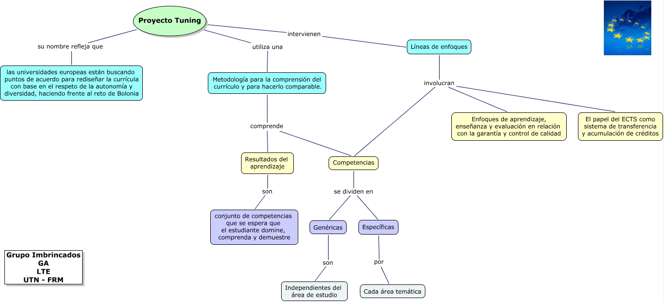 Este Cmap, tiene información relacionada con: GA imbrincados2, Líneas de enfoques involucran Enfoques de aprendizaje, enseñanza y evaluación en relación con la garantía y control de calidad, Competencias se dividen en Genéricas, Líneas de enfoques involucran Competencias, Genéricas son Independientes del área de estudio, Proyecto Tuning intervienen Líneas de enfoques, Líneas de enfoques involucran El papel del ECTS como sistema de transferencia y acumulación de créditos, Metodología para la comprensión del currículo y para hacerlo comparable. comprende Competencias, Proyecto Tuning su nombre refleja que las universidades europeas están buscando puntos de acuerdo para rediseñar la currícula con base en el respeto de la autonomía y diversidad, haciendo frente al reto de Bolonia, Específicas por Cada área temática, Metodología para la comprensión del currículo y para hacerlo comparable. comprende Resultados del aprendizaje, Resultados del aprendizaje son conjunto de competencias que se espera que el estudiante domine, comprenda y demuestre, Competencias se dividen en Específicas, Proyecto Tuning utiliza una Metodología para la comprensión del currículo y para hacerlo comparable.