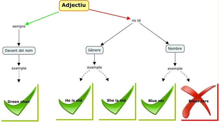 Este mapa conceptual tiene información relacionada a: Característiques adjectius, Gènere exemple She is old, Nombre exemple Blues cars, Adjectiu no té Gènere, Nombre exemple Blue car, Adjectiu no té Nombre, Davant del nom exemple Green chair, Gènere exemple He is old, Adjectiu sempre Davant del nom