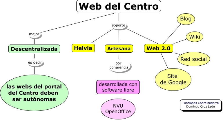 Este Cmap, tiene información relacionada con: webs descentralizadas, desarrollada con software libre NVU OpenOffice, Descentralizada es decir las webs del portal del Centro deben ser autónomas, Artesana por coherencia desarrollada con software libre, Web del Centro soporte Web 2.0, Web 2.0 Blog, Web del Centro soporte Helvia, Web del Centro mejor Descentralizada, Web 2.0 Red social, Web 2.0 Wiki, Web del Centro soporte Artesana, Web 2.0 Site de Google
