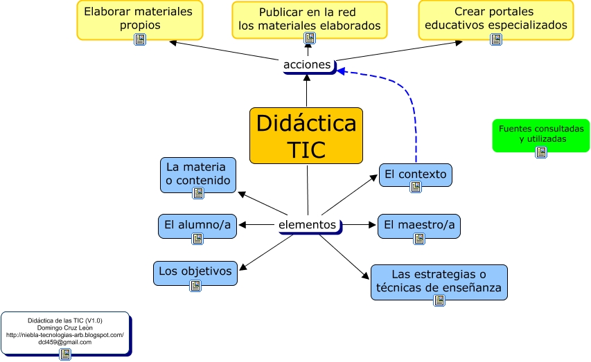Este Cmap, tiene información relacionada con: Didáctica de las TIC, El contexto acciones Elaborar materiales propios, Didáctica TIC elementos El alumno/a, Didáctica TIC elementos El maestro/a, El contexto acciones Publicar en la red los materiales elaborados, El contexto acciones Crear portales educativos especializados, Didáctica TIC elementos Los objetivos, Didáctica TIC elementos La materia o contenido, Didáctica TIC acciones Elaborar materiales propios, Didáctica TIC elementos Las estrategias o técnicas de enseñanza, Didáctica TIC elementos El contexto, Didáctica TIC acciones Crear portales educativos especializados, Didáctica TIC acciones Publicar en la red los materiales elaborados
