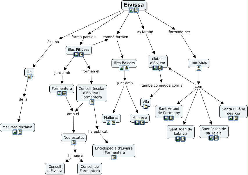 Aquest mapa conceptual conté informació relacionada amb: Illa_Eivissa, Eivissa forma part de illes Pitiüses, Nou estatut hi haurà Consell d'Eivissa, ciutat d'Eivissa també coneguda com a Vila, illes Balears junt amb Mallorca, Eivissa és una illa, illes Balears junt amb Menorca, Eivissa és també ciutat d'Eivissa, municipis com Sant Antoni de Portmany, illes Pitiüses junt amb Formentera, municipis com Santa Eulària des Riu, municipis com Sant Josep de sa Talaia, municipis com ciutat d'Eivissa, Formentera amb el Nou estatut, Consell Insular d'Eivissa i Formentera ha publicat Enciclopèdia d'Eivissa i Formentera, Eivissa formada per municipis, Eivissa també formen illes Balears, illes Pitiüses també formen illes Balears, Consell Insular d'Eivissa i Formentera amb el Nou estatut, Nou estatut hi haurà Consell de Formentera, municipis com Sant Joan de Labritja