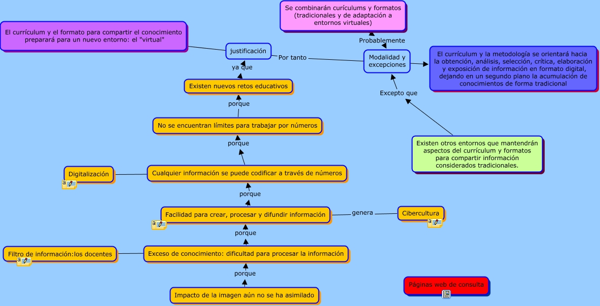 Este Cmap, tiene información relacionada con: Currículum digital por Javier González Iniestar, Exceso de conocimiento: dificultad para procesar la información porque Facilidad para crear, procesar y difundir información, Facilidad para crear, procesar y difundir información porque Cualquier información se puede codificar a través de números, Existen nuevos retos educativos ya que justificación, Cualquier información se puede codificar a través de números porque No se encuentran límites para trabajar por números, El currículum y el formato para compartir el conocimiento preparará para un nuevo entorno: el "virtual" Por tanto El currículum y la metodología se orientará hacia la obtención, análisis, selección, crítica, elaboración y exposición de información en formato digital, dejando en un segundo plano la acumulación de conocimientos de forma tradicional, No se encuentran límites para trabajar por números porque Existen nuevos retos educativos, Impacto de la imagen aún no se ha asimilado porque Exceso de conocimiento: dificultad para procesar la información, Se combinarán curículums y formatos (tradicionales y de adaptación a entornos virtuales) Probablemente Modalidad y excepciones, Filtro de información:los docentes ???? Exceso de conocimiento: dificultad para procesar la información, Existen otros entornos que mantendrán aspectos del currículum y formatos para compartir información considerados tradicionales. Excepto que Modalidad y excepciones, Digitalización ???? Cualquier información se puede codificar a través de números