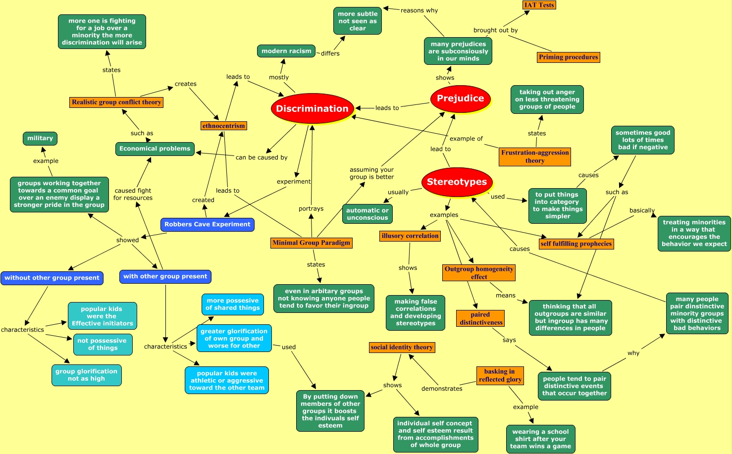 This Concept Map, created with IHMC CmapTools, has information related to: SPD, Discrimination can be caused by Economical problems, many prejudices are subconsiously in our minds brought out by Priming procedures, Robbers Cave Experiment showed groups working together towards a common goal over an enemy display a stronger pride in the group, many prejudices are subconsiously in our minds brought out by IAT Tests, paired distinctiveness says people tend to pair distinctive events that occur together, Prejudice leads to Discrimination, Discrimination experiment Robbers Cave Experiment, Frustration-aggression theory states taking out anger on less threatening groups of people, Stereotypes used to put things into category to make things simpler, Stereotypes usually automatic or unconscious, basking in reflected glory demonstrates social identity theory, Discrimination mostly modern racism, Stereotypes examples self fulfilling prophecies, with other group present characteristics more possesive of shared things, modern racism differs more subtle not seen as clear, Realistic group conflict theory creates ethnocentrism, basking in reflected glory example wearing a school shirt after your team wins a game, Robbers Cave Experiment showed without other group present, Robbers Cave Experiment created ethnocentrism, with other group present caused fight for resources Economical problems