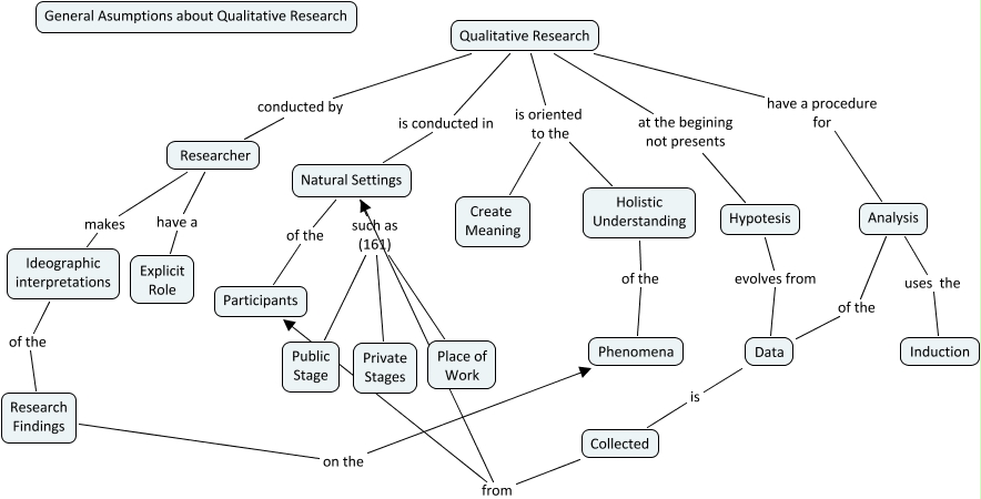 Este Cmap, tiene información relacionada con: Qualitative Research, Analysis of the Data, Qualitative Research is conducted in Natural Settings, Qualitative Research at the begining not presents Hypotesis, Holistic Understanding of the Phenomena, Researcher makes Ideographic interpretations, Researcher have a Explicit Role, Qualitative Research is oriented to the Create Meaning, Qualitative Research have a procedure for Analysis, Analysis uses the Induction, Natural Settings such as (161) Public Stage, Natural Settings such as (161) Place of Work, Natural Settings of the Participants, Hypotesis evolves from Data, Qualitative Research is oriented to the Holistic Understanding, Qualitative Research conducted by Researcher, Ideographic interpretations of the Research Findings, Natural Settings such as (161) Private Stages, Collected from Participants, Research Findings on the Phenomena, Data is Collected