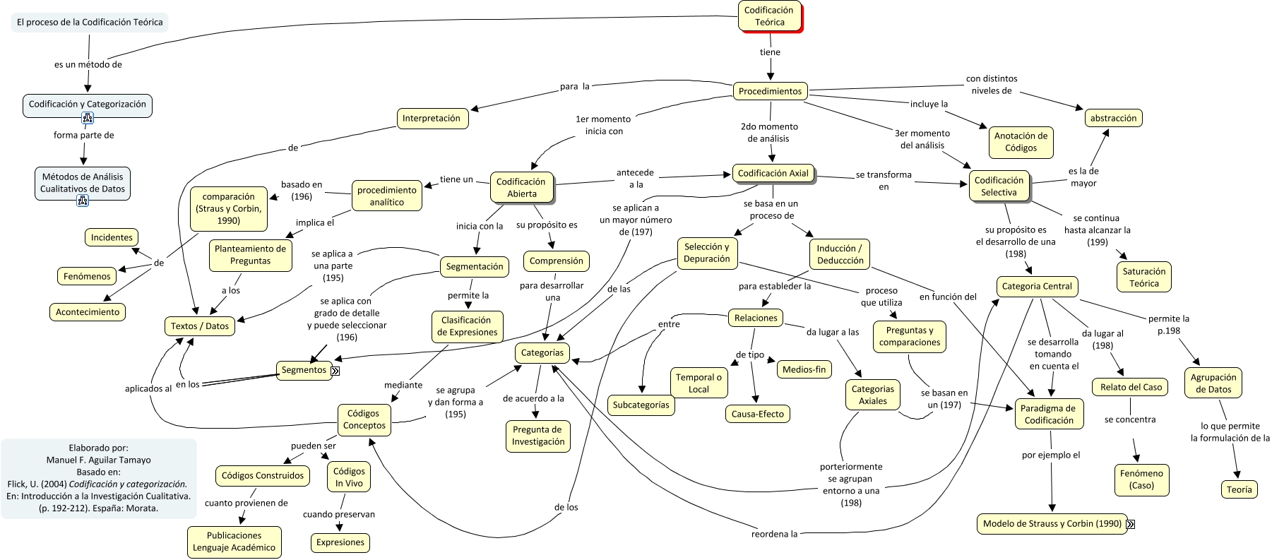 Este Cmap, tiene información relacionada con: Codificación Teórica Completo, comparación (Straus y Corbin, 1990) de Fenómenos, Codificación Teórica es un método de Codificación y Categorización, Códigos Conceptos pueden ser Códigos Construidos, Categorías porteriormente se agrupan entorno a una (198) Categoria Central, Codificación y Categorización forma parte de Métodos de Análisis Cualitativos de Datos, Códigos In Vivo cuando preservan Expresiones, Paradigma de Codificación por ejemplo el Modelo de Strauss y Corbin (1990), comparación (Straus y Corbin, 1990) de Incidentes, Segmentación se aplica con grado de detalle y puede seleccionar (196) Oración, Codificación Abierta tiene un procedimiento analítico, Procedimientos para la Interpretación, Selección y Depuración de los Códigos Conceptos, Categoria Central permite la p.198 Agrupación de Datos, Procedimientos 3er momento del análisis Codificación Selectiva, Códigos Conceptos pueden ser Códigos In Vivo, Segmentación se aplica con grado de detalle y puede seleccionar (196) Párrafo, Codificación Axial se transforma en Codificación Selectiva, Relaciones entre Categorías, Selección y Depuración de las Categorías, Clasificación de Expresiones mediante Códigos Conceptos
