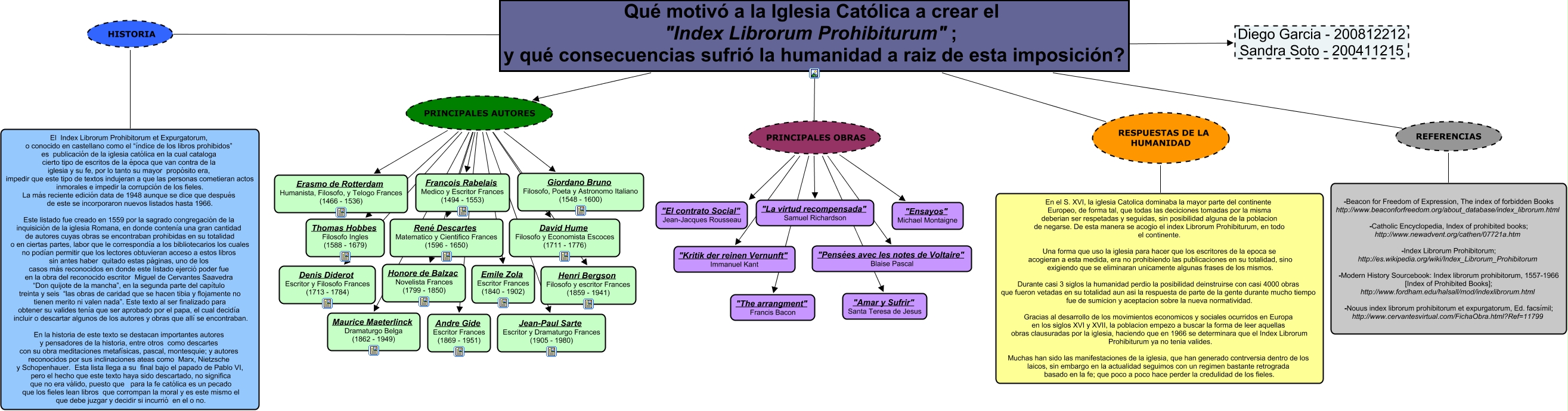 Este Cmap, tiene información relacionada con: Sin Título 2, Qué motivó a la Iglesia Católica a crear el "Index Librorum Prohibiturum"; y qué consecuencias sufrió la humanidad a raiz de esta imposición? PRINCIPALES OBRAS "La virtud recompensada" Samuel Richardson, Qué motivó a la Iglesia Católica a crear el "Index Librorum Prohibiturum"; y qué consecuencias sufrió la humanidad a raiz de esta imposición? PRINCIPALES AUTORES David Hume Filosofo y Economista Escoces (1711 - 1776), Qué motivó a la Iglesia Católica a crear el "Index Librorum Prohibiturum"; y qué consecuencias sufrió la humanidad a raiz de esta imposición? PRINCIPALES OBRAS "Kritik der reinen Vernunft" Immanuel Kant, Qué motivó a la Iglesia Católica a crear el "Index Librorum Prohibiturum"; y qué consecuencias sufrió la humanidad a raiz de esta imposición? PRINCIPALES AUTORES Francois Rabelais Medico y Escritor Frances (1494 - 1553), Qué motivó a la Iglesia Católica a crear el "Index Librorum Prohibiturum"; y qué consecuencias sufrió la humanidad a raiz de esta imposición? PRINCIPALES AUTORES Emile Zola Escritor Frances (1840 - 1902), Qué motivó a la Iglesia Católica a crear el "Index Librorum Prohibiturum"; y qué consecuencias sufrió la humanidad a raiz de esta imposición? PRINCIPALES AUTORES Henri Bergson Filosofo y escritor Frances (1859 - 1941), Qué motivó a la Iglesia Católica a crear el "Index Librorum Prohibiturum"; y qué consecuencias sufrió la humanidad a raiz de esta imposición? PRINCIPALES AUTORES Andre Gide Escritor Frances (1869 - 1951), Qué motivó a la Iglesia Católica a crear el "Index Librorum Prohibiturum"; y qué consecuencias sufrió la humanidad a raiz de esta imposición? PRINCIPALES AUTORES Thomas Hobbes Filosofo Ingles (1588 - 1679), Qué motivó a la Iglesia Católica a crear el "Index Librorum Prohibiturum"; y qué consecuencias sufrió la humanidad a raiz de esta imposición? PRINCIPALES AUTORES Honore de Balzac Novelista Frances (1799 - 1850), Qué motivó a la Iglesia Católica a crear el "Index Librorum Prohibiturum"; y qué consecuencias sufrió la humanidad a raiz de esta imposición? PRINCIPALES OBRAS "El contrato Social" Jean-Jacques Rousseau, Qué motivó a la Iglesia Católica a crear el "Index Librorum Prohibiturum"; y qué consecuencias sufrió la humanidad a raiz de esta imposición? PRINCIPALES AUTORES Jean-Paul Sarte Escritor y Dramaturgo Frances (1905 - 1980), Qué motivó a la Iglesia Católica a crear el "Index Librorum Prohibiturum"; y qué consecuencias sufrió la humanidad a raiz de esta imposición? RESPUESTAS DE LA HUMANIDAD En el S. XVI, la iglesia Catolica dominaba la mayor parte del continente Europeo, de forma tal, que todas las deciciones tomadas por la misma deberian ser respetadas y seguidas, sin posibilidad alguna de la poblacion de negarse. De esta manera se acogio el index Librorum Prohibiturum, en todo el continente. Una forma que uso la iglesia para hacer que los escritores de la epoca se acogieran a esta medida, era no prohibiendo las publicaciones en su totalidad, sino exigiendo que se eliminaran unicamente algunas frases de los mismos. Durante casi 3 siglos la humanidad perdio la posibilidad deinstruirse con casi 4000 obras que fueron vetadas en su totalidad aun asi la respuesta de parte de la gente durante mucho tiempo fue de sumicion y aceptacion sobre la nueva normatividad. Gracias al desarrollo de los movimientos economicos y sociales ocurridos en Europa en los siglos XVI y XVII, la poblacion empezo a buscar la forma de leer aquellas obras clausuradas por la iglesia, haciendo que en 1966 se determinara que el Index Librorum Prohibiturum ya no tenia valides. Muchas han sido las manifestaciones de la iglesia, que han generado contrversia dentro de los laicos, sin embargo en la actualidad seguimos con un regimen bastante retrograda basado en la fe; que poco a poco hace perder la credulidad de los fieles., Qué motivó a la Iglesia Católica a crear el "Index Librorum Prohibiturum"; y qué consecuencias sufrió la humanidad a raiz de esta imposición? PRINCIPALES AUTORES Denis Diderot Escritor y Filosofo Frances (1713 - 1784), Qué motivó a la Iglesia Católica a crear el "Index Librorum Prohibiturum"; y qué consecuencias sufrió la humanidad a raiz de esta imposición? PRINCIPALES OBRAS "Ensayos" Michael Montaigne, Qué motivó a la Iglesia Católica a crear el "Index Librorum Prohibiturum"; y qué consecuencias sufrió la humanidad a raiz de esta imposición? HISTORIA El Index Librorum Prohibitorum et Expurgatorum, o conocido en castellano como el “índice de los libros prohibidos” es publicación de la iglesia católica en la cual cataloga cierto tipo de escritos de la época que van contra de la iglesia y su fe, por lo tanto su mayor propósito era, impedir que este tipo de textos indujeran a que las personas cometieran actos inmorales e impedir la corrupción de los fieles. La más reciente edición data de 1948 aunque se dice que después de este se incorporaron nuevos listados hasta 1966. Este listado fue creado en 1559 por la sagrado congregación de la inquisición de la iglesia Romana, en donde contenía una gran cantidad de autores cuyas obras se encontraban prohibidas en su totalidad o en ciertas partes, labor que le correspondía a los bibliotecarios los cuales no podían permitir que los lectores obtuvieran acceso a estos libros sin antes haber quitado estas páginas, uno de los casos más reconocidos en donde este listado ejerció poder fue en la obra del reconocido escritor Miguel de Cervantes Saavedra “Don quijote de la mancha”, en la segunda parte del capítulo treinta y seis “las obras de caridad que se hacen tibia y flojamente no tienen merito ni valen nada”. Este texto al ser finalizado para obtener su valides tenía que ser aprobado por el papa, el cual decidía incluir o descartar algunos de los autores y obras que allí se encontraban. En la historia de este texto se destacan import