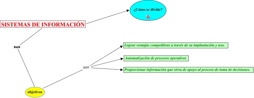 Este Cmap, tiene información relacionada con: TIPOS DE SISTEMAS DE INFORMACIÓN_MAMM, objetivos son Automatización de procesos operativos, objetivos son Lograr ventajas competitivas a través de su implantación y uso., SISTEMAS DE INFORMACIÓN ¿Cómo se divide?, objetivos son Proporcionar información que sirva de apoyo al proceso de toma de decisiones., SISTEMAS DE INFORMACIÓN sus objetivos