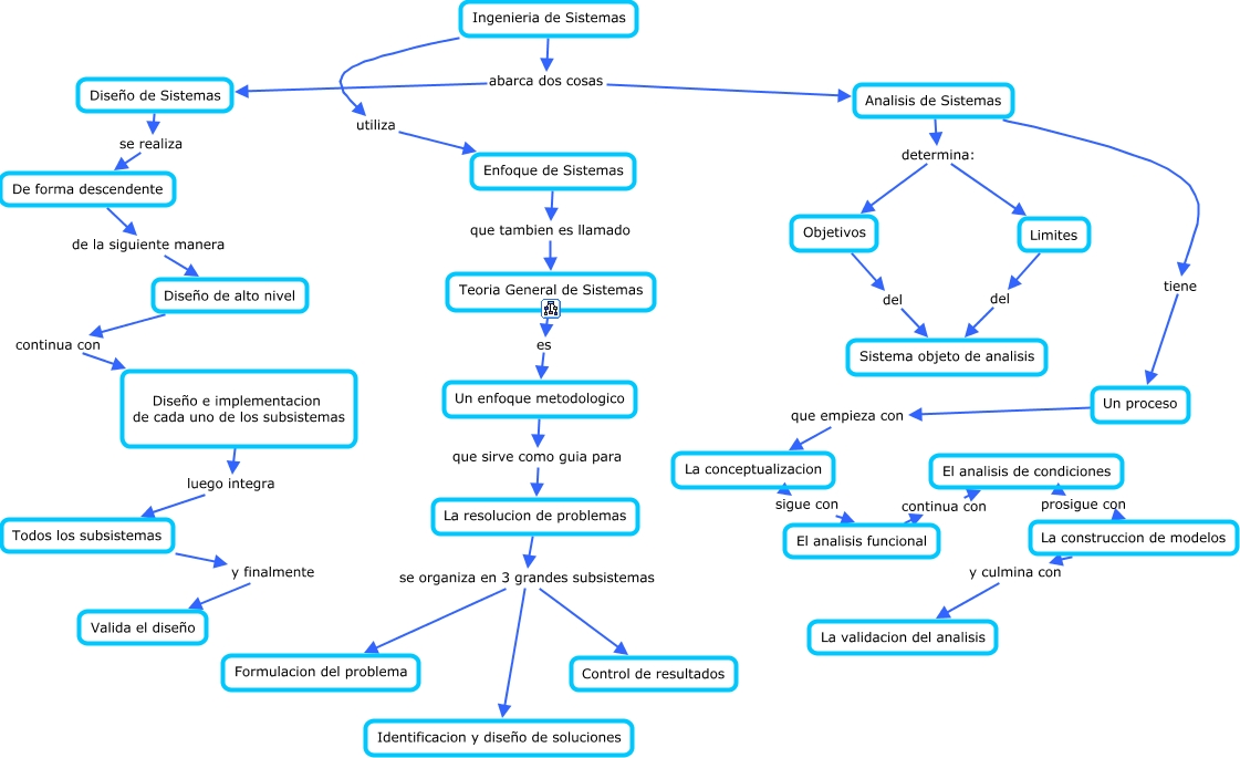 Este Cmap, tiene información relacionada con: ed.cmap, Ingenieria de Sistemas abarca dos cosas Diseño de Sistemas, Ingenieria de Sistemas abarca dos cosas Analisis de Sistemas, Un proceso que empieza con La conceptualizacion, Teoria General de Sistemas es Un enfoque metodologico, Ingenieria de Sistemas utiliza Enfoque de Sistemas, Analisis de Sistemas tiene Un proceso, La resolucion de problemas se organiza en 3 grandes subsistemas Formulacion del problema, La resolucion de problemas se organiza en 3 grandes subsistemas Identificacion y diseño de soluciones, La resolucion de problemas se organiza en 3 grandes subsistemas Control de resultados, Diseño e implementacion de cada uno de los subsistemas luego integra Todos los subsistemas, Un enfoque metodologico que sirve como guia para La resolucion de problemas, Limites del Sistema objeto de analisis, Objetivos del Sistema objeto de analisis, Diseño de alto nivel continua con Diseño e implementacion de cada uno de los subsistemas, De forma descendente de la siguiente manera Diseño de alto nivel, Analisis de Sistemas determina: Limites, Diseño de Sistemas se realiza De forma descendente, La conceptualizacion sigue con El analisis funcional, Enfoque de Sistemas que tambien es llamado Teoria General de Sistemas, Todos los subsistemas y finalmente Valida el diseño