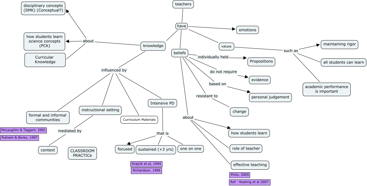 This Concept Map, created with IHMC CmapTools, has information related to: Teachers KAB, beliefs about effective teaching, knowledge about disciplinary concepts (SMK) (Conceptual?), beliefs based on personal judgement, knowledge influenced by formal and informal communities, Intensive PD that is focused, instructional setting influenced by Curriculum Materials, teachers have knowledge, beliefs do not require evidence, knowledge about how students learn science concepts (PCK), teachers have beliefs, beliefs about role of teacher, Intensive PD influenced by formal and informal communities, beliefs individually held Propositions, Intensive PD that is sustained (+3 yrs), knowledge influenced by Curriculum Materials, instructional setting mediated by context, values such as maintaining rigor, knowledge about Curricular Knowledge, beliefs about how students learn, Intensive PD influenced by Curriculum Materials