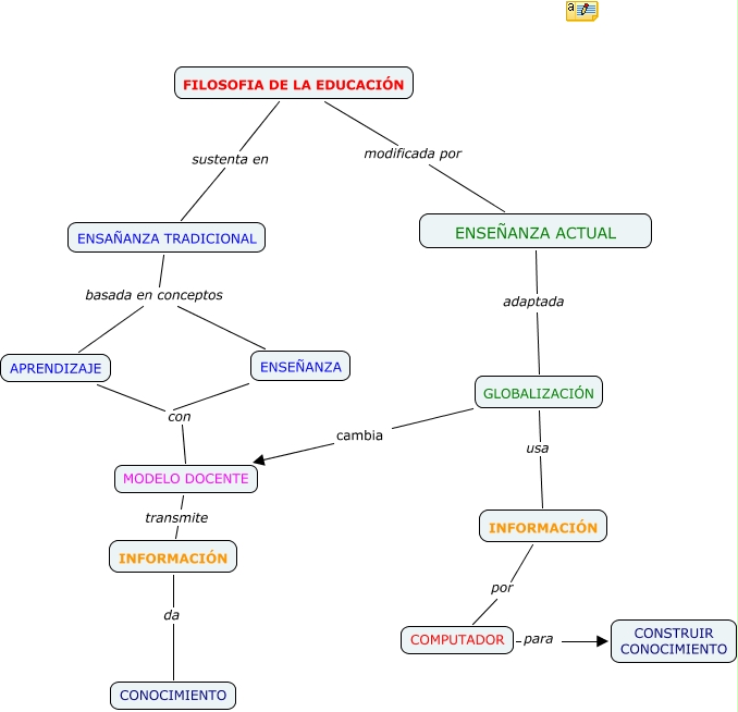 Este Cmap, tiene información relacionada con: Arcángela M, ENSEÑANZA con MODELO DOCENTE, FILOSOFIA DE LA EDUCACIÓN modificada por ENSEÑANZA ACTUAL, INFORMACIÓN por COMPUTADOR, ENSAÑANZA TRADICIONAL basada en conceptos APRENDIZAJE, ENSEÑANZA ACTUAL adaptada GLOBALIZACIÓN, GLOBALIZACIÓN cambia MODELO DOCENTE, ENSAÑANZA TRADICIONAL basada en conceptos ENSEÑANZA, APRENDIZAJE con MODELO DOCENTE, INFORMACIÓN da CONOCIMIENTO, FILOSOFIA DE LA EDUCACIÓN sustenta en ENSAÑANZA TRADICIONAL, COMPUTADOR para CONSTRUIR CONOCIMIENTO, MODELO DOCENTE transmite INFORMACIÓN, GLOBALIZACIÓN usa INFORMACIÓN