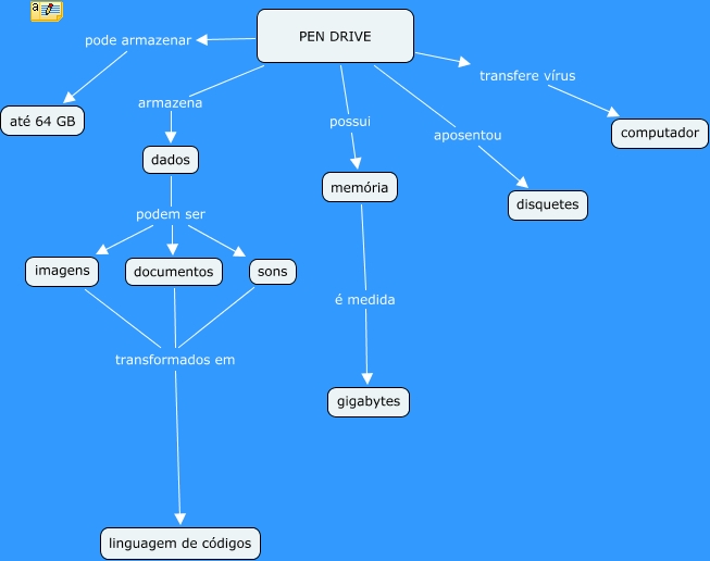 Esse mapa conceitual, produzido no IHMC CmapTools, tem a informação relacionada a: mapa1_coletivo_final, memória é medida gigabytes, PEN DRIVE armazena dados, PEN DRIVE aposentou disquetes, imagens transformados em linguagem de códigos, dados podem ser documentos, PEN DRIVE transfere vírus computador, PEN DRIVE possui memória, sons transformados em linguagem de códigos, documentos transformados em linguagem de códigos, dados podem ser imagens, dados podem ser sons, PEN DRIVE pode armazenar até 64 GB