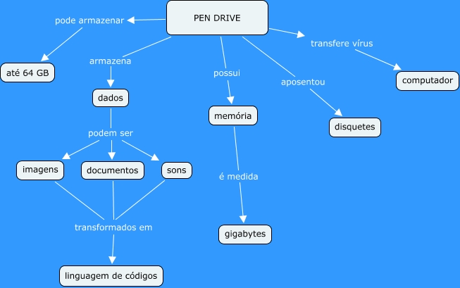 Esse mapa conceitual, produzido no IHMC CmapTools, tem a informação relacionada a: mapa_coletivo_final, memória é medida gigabytes, PEN DRIVE armazena dados, PEN DRIVE aposentou disquetes, imagens transformados em linguagem de códigos, dados podem ser documentos, PEN DRIVE transfere vírus computador, PEN DRIVE possui memória, sons transformados em linguagem de códigos, documentos transformados em linguagem de códigos, dados podem ser imagens, dados podem ser sons, PEN DRIVE pode armazenar até 64 GB