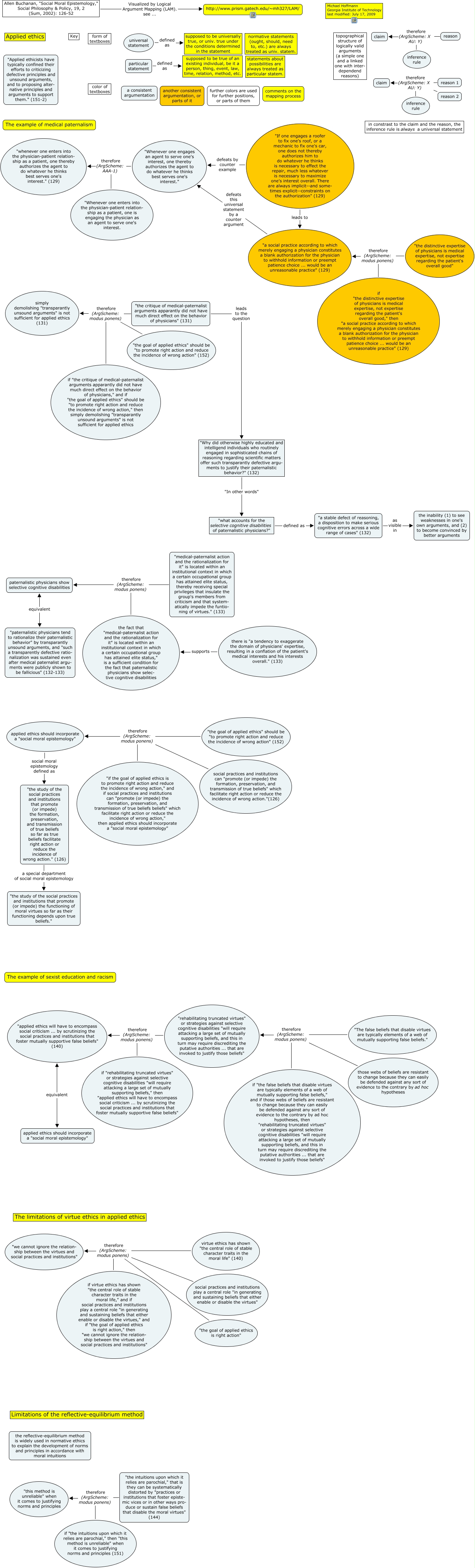 This Concept Map, created with IHMC CmapTools, has information related to: Buchanan_2002_social moral epistemology, "the goal of applied ethics is right action" therefore (ArgScheme: modus ponens) "we cannot ignore the relation- ship between the virtues and social practices and institutions", "if the goal of applied ethics is to promote right action and reduce the incidence of wrong action," and if social practices and institutions can "promote (or impede) the formation, preservation, and transmission of true beliefs beliefs" which facilitate right action or reduce the incidence of wrong action," then applied ethics should incorporate a "social moral epistemology" therefore (ArgScheme: modus ponens) applied ethics should incorporate a "social moral epistemology", universal statement defined as supposed to be universally true, or univ. true under the conditions determined in the statement, "the intuitions upon which it relies are parochial," that is they can be systematically distorted by "practices or institutions that foster episte- mic vices or in other ways pro- duce or sustain false beliefs that disable the moral virtues" (144) therefore (ArgScheme: modus ponens) "this method is unreliable" when it comes to justifying norms and principles, "Why did otherwise highly educated and intelligend individuals who routinely engaged in sophisticated chains of reasoning regarding scientific matters offer such transparantly defective argu- ments to justify their paternalistic behavior?" (132) "In other words" "what accounts for the selective cognitive disabilities of paternalistic physicians?", "the goal of applied ethics" should be "to promote right action and reduce the incidence of wrong action" (152) therefore (ArgScheme: modus ponens) applied ethics should incorporate a "social moral epistemology", "what accounts for the selective cognitive disabilities of paternalistic physicians?" defined as "a stable defect of reasoning, a disposition to make serious cognitive errors across a wide range of cases" (132), reason therefore (ArgScheme: X AU: Y) claim, "the distinctive expertise of physicians is medical expertise, not expertise regarding the patient's overall good" therefore (ArgScheme: modus ponens) "a social practice according to which merely engaging a physician constitutes a blank authorization for the physician to withhold information or preempt patience choice ... would be an unreasonable practice" (129), "medical-paternalist action and the rationalization for it" is located within an institutional context in which a certain occupational group has attained elite status, thereby receiving special privileges that insulate the group's members from criticism and that system- atically impede the funtio- ning of virtues." (133) therefore (ArgScheme: modus ponens) paternalistic physicians show selective cognitive disabilities, if "the critique of medical-paternalist arguments apparantly did not have much direct effect on the behavior of physicians," and if "the goal of applied ethics" should be "to promote right action and reduce the incidence of wrong action," then simply demolishing "transparantly unsound arguments" is not sufficient for applied ethics therefore (ArgScheme: modus ponens) simply demolishing "transparantly unsound arguments" is not sufficient for applied ethics (131), the fact that "medical-paternalist action and the rationalization for it" is located within an institutional context in which a certain occupational group has attained elite status," is a sufficient condition for the fact that paternalistic physicians show selec- tive cognitive disabilities therefore (ArgScheme: modus ponens) paternalistic physicians show selective cognitive disabilities, social practices and institutions play a central role "in generating and sustaining beliefs that either enable or disable the virtues" therefore (ArgScheme: modus ponens) "we cannot ignore the relation- ship between the virtues and social practices and institutions", "Whenever one enters into the physician-patient relation- ship as a patient, one is engaging the physician as an agent to serve one's interest. therefore (ArgScheme: AAA-1) "whenever one enters into the physician-patient relation- ship as a patient, one thereby authorizes the agent to do whatever he thinks best serves one's interest." (129), if virtue ethics has shown "the central role of stable character traits in the moral life," and if social practices and institutions play a central role "in generating and sustaining beliefs that either enable or disable the virtues," and if "the goal of applied ethics is right action," then "we cannot ignore the relation- ship between the virtues and social practices and institutions" therefore (ArgScheme: modus ponens) "we cannot ignore the relation- ship between the virtues and social practices and institutions", "the study of the social practices and institutions that promote (or impede) the formation, preservation, and transmission of true beliefs so far as true beliefs facilitate right action or reduce the incidence of wrong action." (126) a special department of social moral epistemology "the study of the social practices and institutions that promote (or impede) the functioning of moral virtues so far as their functioning depends upon true beliefs.", social practices and institutions can "promote (or impede) the formation, preservation, and transmission of true beliefs" which facilitate right action or reduce the incidence of wrong action."(126) therefore (ArgScheme: modus ponens) applied ethics should incorporate a "social moral epistemology", if "the false beliefs that disable virtues are typically elements of a web of mutually supporting false beliefs," and if those webs of beliefs are resistant to change because they can easily be defended against any sort of evidence to the contrary by ad hoc hypotheses, then "rehabilitating truncated virtues" or strategies against selective cognitive disabilities "will require atta