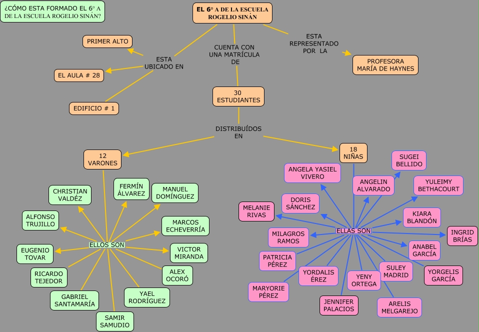 Este Cmap, tiene información relacionada con: 6° GRADO A MARÍA DE HAYNES, 18 NIÑAS ELLAS SON KIARA BLANDÓN, 18 NIÑAS ELLAS SON SULEY MADRID, 18 NIÑAS ELLAS SON MARYORIE PÉREZ, 18 NIÑAS ELLAS SON YENY ORTEGA, 12 VARONES ELLOS SON VICTOR MIRANDA, 12 VARONES ELLOS SON CHRISTIAN VALDÉZ, 12 VARONES ELLOS SON MANUEL DOMÍNGUEZ, 30 ESTUDIANTES DISTRIBUÍDOS EN 18 NIÑAS, 18 NIÑAS ELLAS SON ANABEL GARCÍA, 18 NIÑAS ELLAS SON JENNIFER PALACIOS, 30 ESTUDIANTES DISTRIBUÍDOS EN 12 VARONES, 12 VARONES ELLOS SON GABRIEL SANTAMARÍA, EL 6° A DE LA ESCUELA ROGELIO SINÁN CUENTA CON UNA MATRÍCULA DE 30 ESTUDIANTES, 18 NIÑAS ELLAS SON ARELIS MELGAREJO, 18 NIÑAS ELLAS SON SUGEI BELLIDO, 18 NIÑAS ELLAS SON YORDALIS ÉREZ, 12 VARONES ELLOS SON FERMÍN ÁLVAREZ, 18 NIÑAS ELLAS SON INGRID BRÍAS, 18 NIÑAS ELLAS SON DORIS SÁNCHEZ, EL 6° A DE LA ESCUELA ROGELIO SINÁN ESTA UBICADO EN PRIMER ALTO