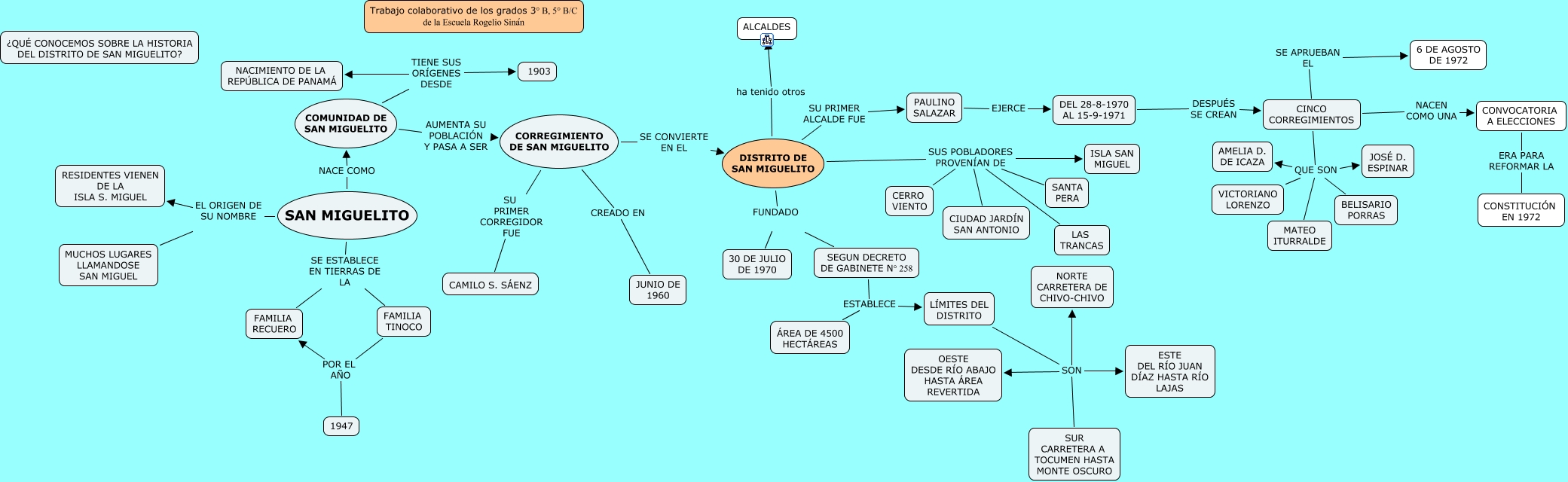 Este Cmap, tiene información relacionada con: HISTORIA DE SAN MIGUELITO COLABORACIÓN, LÍMITES DEL DISTRITO SON OESTE DESDE RÍO ABAJO HASTA ÁREA REVERTIDA, CINCO CORREGIMIENTOS QUE SON BELISARIO PORRAS, CINCO CORREGIMIENTOS QUE SON MATEO ITURRALDE, CONVOCATORIA A ELECCIONES ERA PARA REFORMAR LA CONSTITUCIÓN EN 1972, LÍMITES DEL DISTRITO SON SUR CARRETERA A TOCUMEN HASTA MONTE OSCURO, CORREGIMIENTO DE SAN MIGUELITO SE CONVIERTE EN EL DISTRITO DE SAN MIGUELITO, DISTRITO DE SAN MIGUELITO SUS POBLADORES PROVENÍAN DE CIUDAD JARDÍN SAN ANTONIO, COMUNIDAD DE SAN MIGUELITO TIENE SUS ORÍGENES DESDE NACIMIENTO DE LA REPÚBLICA DE PANAMÁ, CINCO CORREGIMIENTOS SE APRUEBAN EL 6 DE AGOSTO DE 1972, FAMILIA TINOCO POR EL AÑO 1947, CORREGIMIENTO DE SAN MIGUELITO CREADO EN JUNIO DE 1960, SAN MIGUELITO NACE COMO COMUNIDAD DE SAN MIGUELITO, SEGUN DECRETO DE GABINETE N° 258 ESTABLECE LÍMITES DEL DISTRITO, LÍMITES DEL DISTRITO SON NORTE CARRETERA DE CHIVO-CHIVO, LÍMITES DEL DISTRITO SON ESTE DEL RÍO JUAN DÍAZ HASTA RÍO LAJAS, CINCO CORREGIMIENTOS QUE SON JOSÉ D. ESPINAR, COMUNIDAD DE SAN MIGUELITO AUMENTA SU POBLACIÓN Y PASA A SER CORREGIMIENTO DE SAN MIGUELITO, SAN MIGUELITO SE ESTABLECE EN TIERRAS DE LA FAMILIA TINOCO, DISTRITO DE SAN MIGUELITO SUS POBLADORES PROVENÍAN DE SANTA PERA, CORREGIMIENTO DE SAN MIGUELITO SU PRIMER CORREGIDOR FUE CAMILO S. SÁENZ