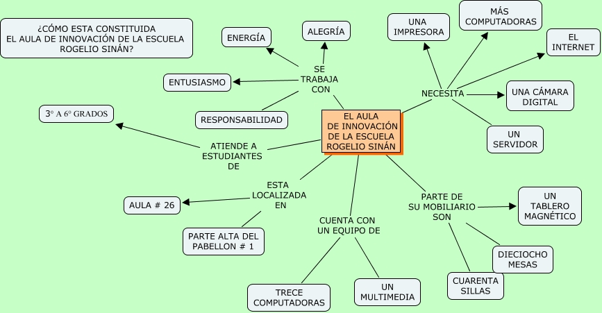Este Cmap, tiene información relacionada con: AULA DE INNOVACIÓN, EL AULA DE INNOVACIÓN DE LA ESCUELA ROGELIO SINÁN ATIENDE A ESTUDIANTES DE 3° A 6° GRADOS, EL AULA DE INNOVACIÓN DE LA ESCUELA ROGELIO SINÁN NECESITA MÁS COMPUTADORAS, EL AULA DE INNOVACIÓN DE LA ESCUELA ROGELIO SINÁN ESTA LOCALIZADA EN AULA # 26, EL AULA DE INNOVACIÓN DE LA ESCUELA ROGELIO SINÁN NECESITA EL INTERNET, EL AULA DE INNOVACIÓN DE LA ESCUELA ROGELIO SINÁN SE TRABAJA CON ENTUSIASMO, EL AULA DE INNOVACIÓN DE LA ESCUELA ROGELIO SINÁN NECESITA UN SERVIDOR, EL AULA DE INNOVACIÓN DE LA ESCUELA ROGELIO SINÁN NECESITA UNA IMPRESORA, EL AULA DE INNOVACIÓN DE LA ESCUELA ROGELIO SINÁN PARTE DE SU MOBILIARIO SON UN TABLERO MAGNÉTICO, EL AULA DE INNOVACIÓN DE LA ESCUELA ROGELIO SINÁN PARTE DE SU MOBILIARIO SON CUARENTA SILLAS, EL AULA DE INNOVACIÓN DE LA ESCUELA ROGELIO SINÁN SE TRABAJA CON RESPONSABILIDAD, EL AULA DE INNOVACIÓN DE LA ESCUELA ROGELIO SINÁN CUENTA CON UN EQUIPO DE UN MULTIMEDIA, EL AULA DE INNOVACIÓN DE LA ESCUELA ROGELIO SINÁN SE TRABAJA CON ALEGRÍA, EL AULA DE INNOVACIÓN DE LA ESCUELA ROGELIO SINÁN NECESITA UNA CÁMARA DIGITAL, EL AULA DE INNOVACIÓN DE LA ESCUELA ROGELIO SINÁN SE TRABAJA CON ENERGÍA, EL AULA DE INNOVACIÓN DE LA ESCUELA ROGELIO SINÁN ESTA LOCALIZADA EN PARTE ALTA DEL PABELLON # 1, EL AULA DE INNOVACIÓN DE LA ESCUELA ROGELIO SINÁN CUENTA CON UN EQUIPO DE TRECE COMPUTADORAS, EL AULA DE INNOVACIÓN DE LA ESCUELA ROGELIO SINÁN PARTE DE SU MOBILIARIO SON DIECIOCHO MESAS