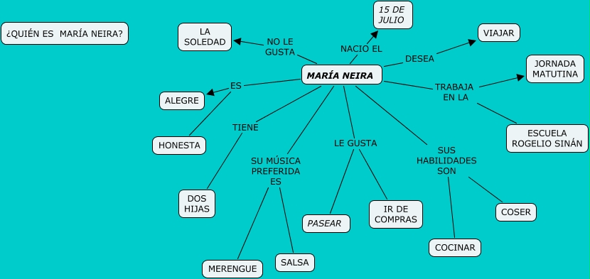 Este Cmap, tiene información relacionada con: MARÍA NEIRA, MARÍA NEIRA NACIO EL 15 DE JULIO, MARÍA NEIRA SU MÚSICA PREFERIDA ES MERENGUE, MARÍA NEIRA TRABAJA EN LA ESCUELA ROGELIO SINÁN, MARÍA NEIRA TIENE DOS HIJAS, MARÍA NEIRA DESEA VIAJAR, MARÍA NEIRA NO LE GUSTA LA SOLEDAD, MARÍA NEIRA LE GUSTA PASEAR, MARÍA NEIRA SU MÚSICA PREFERIDA ES SALSA, MARÍA NEIRA SUS HABILIDADES SON COCINAR, MARÍA NEIRA ES HONESTA, MARÍA NEIRA ES ALEGRE, MARÍA NEIRA SUS HABILIDADES SON COSER, MARÍA NEIRA TRABAJA EN LA JORNADA MATUTINA, MARÍA NEIRA LE GUSTA IR DE COMPRAS