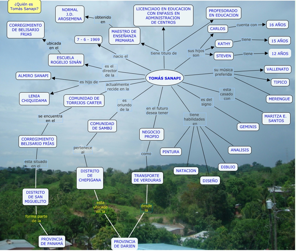Este Cmap, tiene información relacionada con: Director Tomás Sanapi Ch, TOMÁS SANAPI esta casado con MARITZA E. SANTOS, TOMÁS SANAPI su música preferida VALLENATO, NEGOCIO PROPIO como TRANSPORTE DE VERDURAS, TOMÁS SANAPI sus hijos son KATHY, KATHY tiene 15 AÑOS, CARLOS cuenta con 16 AÑOS, TOMÁS SANAPI es del signo GEMINIS, TOMÁS SANAPI su música preferida MERENGUE, TOMÁS SANAPI sus hijos son STEVEN, TOMÁS SANAPI su música preferida TIPICO, TOMÁS SANAPI tiene habilidades en DIBUJO, CORREGIMIENTO BELISARIO FRÍAS esta situado en el DISTRITO DE SAN MIGUELITO, TOMÁS SANAPI es el director de la ESCUELA ROGELIO SINÁN, TRANSPORTE DE VERDURAS desde la PROVINCIA DE DARIEN, COMUNIDAD DE TORRIJOS CARTER se encuentra en el CORREGIMIENTO BELISARIO FRÍAS, DISTRITO DE CHEPIGANA esta ubicado en la PROVINCIA DE DARIEN, TOMÁS SANAPI actualmente recide en la COMUNIDAD DE TORRIJOS CARTER, STEVEN tiene 12 AÑOS, ESCUELA ROGELIO SINÁN ubicada en el CORREGIMIENTO DE BELISARIO FRIAS, TOMÁS SANAPI tiene titulo de MAESTRO DE ENSEÑANZA PRIMARIA