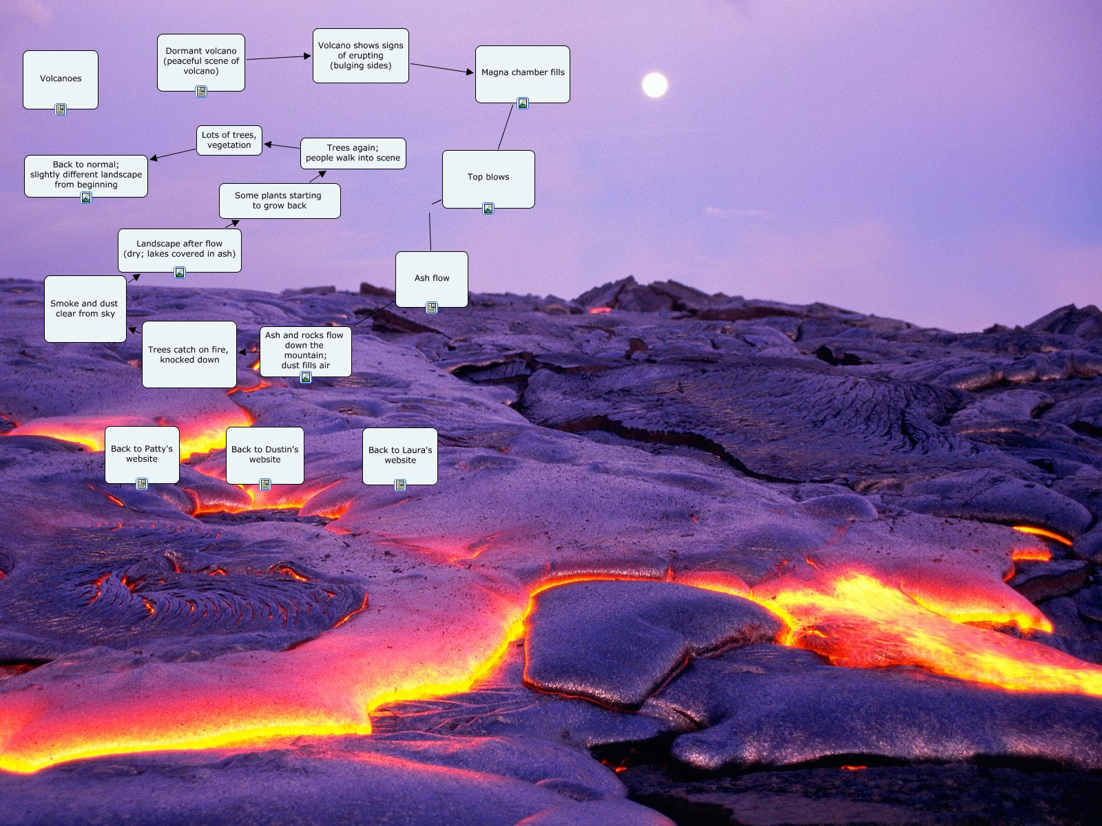 This Concept Map, created with IHMC CmapTools, has information related to: Volcanoes cmap, Lots of trees, vegetation Back to normal; slightly different landscape from beginning, Trees again; people walk into scene Lots of trees, vegetation, Smoke and dust clear from sky Landscape after flow (dry; lakes covered in ash), Magna chamber fills Top blows, Volcano shows signs of erupting (bulging sides) Magna chamber fills, Landscape after flow (dry; lakes covered in ash) Some plants starting to grow back, Trees catch on fire, knocked down Smoke and dust clear from sky, Top blows Ash flow, Some plants starting to grow back Trees again; people walk into scene, Ash and rocks flow down the mountain; dust fills air Trees catch on fire, knocked down, Ash flow Ash and rocks flow down the mountain; dust fills air, Dormant volcano (peaceful scene of volcano) Volcano shows signs of erupting (bulging sides)
