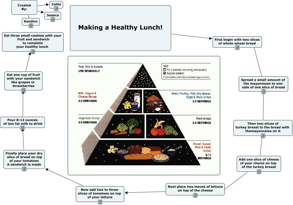 This Concept Map, created with IHMC CmapTools, has information related to: Untitled 2, Now add two to three slices of tomatoes on top of your lettuce Finally place your dry slice of bread on top of your tomatoes A sandwich is made, Spread a small amount of lite mayonniase to one side of one slice of bread Then two slices of turkey breast to the bread with themayonnaise on it, Pour 8-12 ounces of low fat milk to drink Eat one cup of fruit with your sandwich like grapes or strawberries, Making a Healthy Lunch! First begin with two slices of whole wheat bread, First begin with two slices of whole wheat bread ???? Spread a small amount of lite mayonniase to one side of one slice of bread, Eat one cup of fruit with your sandwich like grapes or strawberries Eat three small cookies with your fruit and sandwich to complete your healthy lunch, Add one slice of cheese of your choice on top of the turkey breast ???? Now add two to three slices of tomatoes on top of your lettuce, Finally place your dry slice of bread on top of your tomatoes A sandwich is made Pour 8-12 ounces of low fat milk to drink, Created By: Kandice, Next place two leaves of lettuce on top of the cheese ???? Now add two to three slices of tomatoes on top of your lettuce, Created By: Callie, Then two slices of turkey breast to the bread with themayonnaise on it Add one slice of cheese of your choice on top of the turkey breast, Created By: Jessica