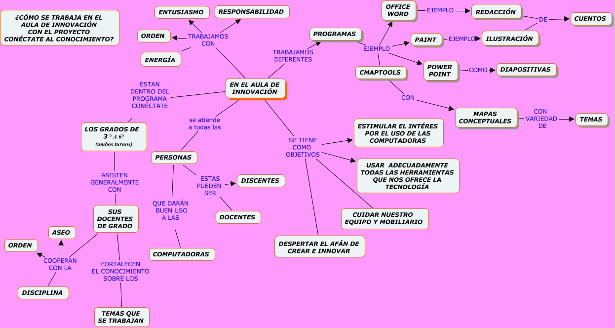 Este Cmap, tiene información relacionada con: TRABAJO EN EL Aula de Innovación, PERSONAS ESTAS PUEDEN SER DOCENTES, PROGRAMAS EJEMPLO PAINT, PERSONAS QUE DARÁN BUEN USO A LAS COMPUTADORAS, EN EL AULA DE INNOVACIÓN SE TIENE COMO OBJETIVOS ESTIMULAR EL INTÉRES POR EL USO DE LAS COMPUTADORAS, PROGRAMAS EJEMPLO POWER POINT, CMAPTOOLS CON MAPAS CONCEPTUALES, SUS DOCENTES DE GRADO COOPERAN CON LA DISCIPLINA, PAINT EJEMPLO ILUSTRACIÓN, EN EL AULA DE INNOVACIÓN ESTAN DENTRO DEL PROGRAMA CONÉCTATE LOS GRADOS DE 3° A 6° (ambos turnos), EN EL AULA DE INNOVACIÓN TRABAJAMOS CON ENTUSIASMO, EN EL AULA DE INNOVACIÓN se atiende a todas las PERSONAS, LOS GRADOS DE 3° A 6° (ambos turnos) ASISTEN GENERALMENTE CON SUS DOCENTES DE GRADO, EN EL AULA DE INNOVACIÓN SE TIENE COMO OBJETIVOS USAR ADECUADAMENTE TODAS LAS HERRAMIENTAS QUE NOS OFRECE LA TECNOLOGÍA, REDACCIÓN DE ILUSTRACIÓN, EN EL AULA DE INNOVACIÓN TRABAJAMOS CON RESPONSABILIDAD, SUS DOCENTES DE GRADO COOPERAN CON LA ASEO, SUS DOCENTES DE GRADO COOPERAN CON LA ORDEN, OFFICE WORD EJEMPLO REDACCIÓN, EN EL AULA DE INNOVACIÓN SE TIENE COMO OBJETIVOS CUIDAR NUESTRO EQUIPO Y MOBILIARIO, MAPAS CONCEPTUALES CON VARIEDAD DE TEMAS