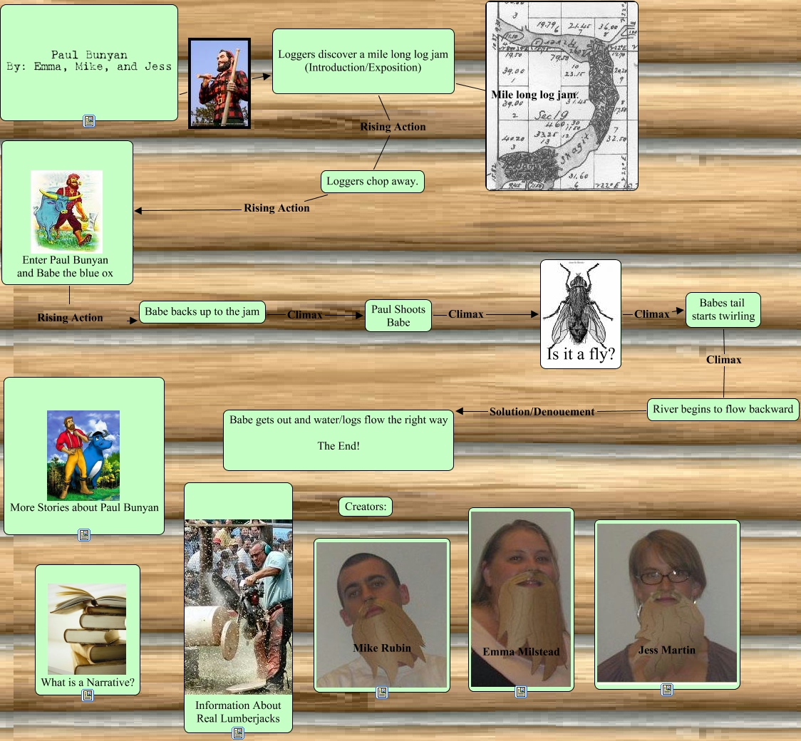 This Concept Map, created with IHMC CmapTools, has information related to: Paul Bunyan, Babes tail starts twirling Climax River begins to flow backward, River begins to flow backward Solution/Denouement Babe gets out and water/logs flow the right way The End!, Paul Shoots Babe Climax Is it a fly?, Enter Paul Bunyan and Babe the blue ox Rising Action Babe backs up to the jam, Babe backs up to the jam Climax Paul Shoots Babe, Loggers chop away. Rising Action Enter Paul Bunyan and Babe the blue ox, Paul Bunyan By: Emma, Mike, and Jess ???? Loggers discover a mile long log jam (Introduction/Exposition), Loggers discover a mile long log jam (Introduction/Exposition) Mile long log jam., Loggers discover a mile long log jam (Introduction/Exposition) Rising Action Loggers chop away., Is it a fly? Climax Babes tail starts twirling