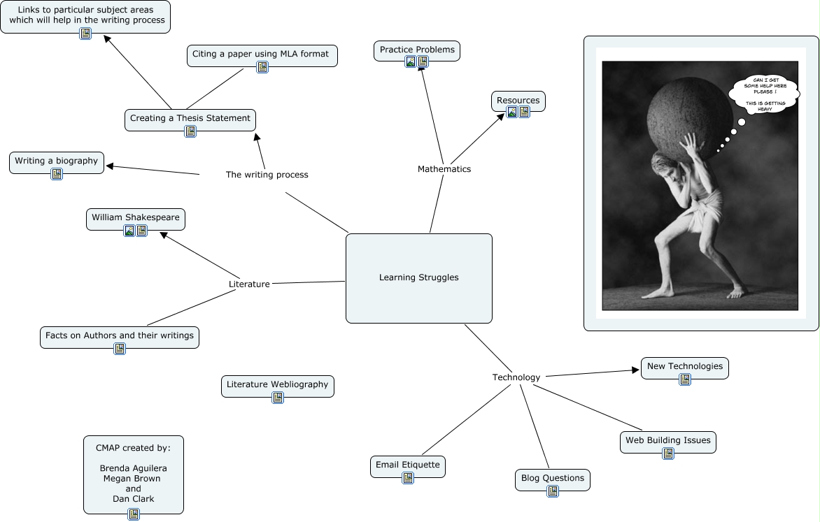 This Concept Map, created with IHMC CmapTools, has information related to: Brenda, Megan, Dan, Citing a paper using MLA format ???? Creating a Thesis Statement, Learning Struggles Technology Web Building Issues, Learning Struggles Technology New Technologies, Learning Struggles Technology Blog Questions, Citing a paper using MLA format ???? Links to particular subject areas which will help in the writing process, Learning Struggles Technology Email Etiquette, Citing a paper using MLA format ???? Creating a Thesis Statement, Learning Struggles Mathematics Practice Problems, Learning Struggles Literature Facts on Authors and their writings, Learning Struggles The writing process Creating a Thesis Statement, Learning Struggles Literature William Shakespeare, Learning Struggles Mathematics Resources, Learning Struggles The writing process Writing a biography