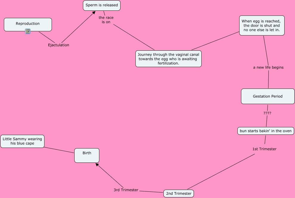 This Concept Map, created with IHMC CmapTools, has information related to: Sperm, 2nd Trimester 3rd Trimester Birth, Journey through the vaginal canal towards the egg who is awaiting fertilization. ???? When egg is reached, the door is shut and no one else is let in., When egg is reached, the door is shut and no one else is let in. a new life begins Gestation Period, bun starts bakin' in the oven 1st Trimester 2nd Trimester, Gestation Period ???? bun starts bakin' in the oven, Reproduction Ejactulation Sperm is released, Sperm is released the race is on Journey through the vaginal canal towards the egg who is awaiting fertilization., Birth Little Sammy wearing his blue cape