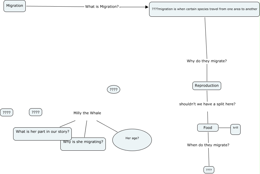 This Concept Map, created with IHMC CmapTools, has information related to: Whale Migration, Migration What is Migration? ????migration is when certain species travel from one area to another, Food When do they migrate? ????, Food ???? krill, Why is she migrating? Milly the Whale What is her part in our story?, Why is she migrating? Milly the Whale Her age?, ????migration is when certain species travel from one area to another Why do they migrate? Reproduction, Reproduction shouldn't we have a split here? Food